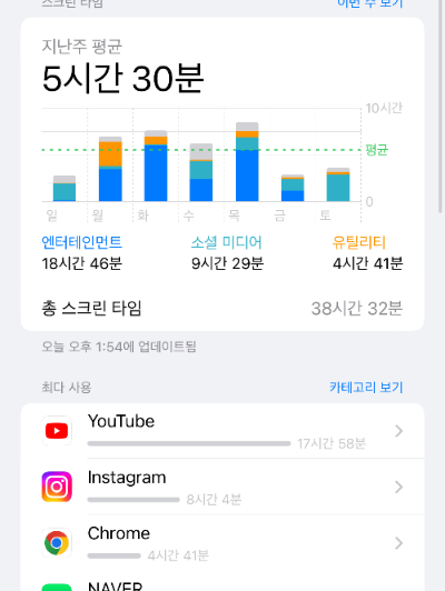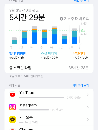 일주일 평균으로 보면, 유튜브는 하루 평균 1 시간 57분, 약 2시간을 사용하고, 인스타그램은 하루 평균 1시간 25분을 사용한다. 하루에 평균적으로 약 3시간 30분은 유튜브와 인스타그램을 사용한다는 것이다. 저번 주 유튜브 총 시청시간은 9시간 50분, 인스타그램 7시간, 도합 약 17시간을 사용했고, 저번주는 유튜브 17시간 58분, 인스타그램 8시간, 도합 약 26시간이라는 정신 나가버린 기록을 세웠다.