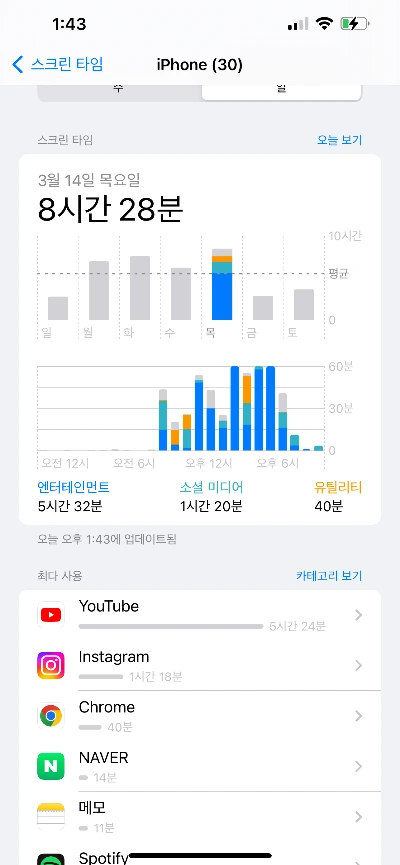 전날은 유튜브 2시간 15분, 인스타그램 1시간 40분, 도합 3시간 55분이라는 기록을 세웠다.