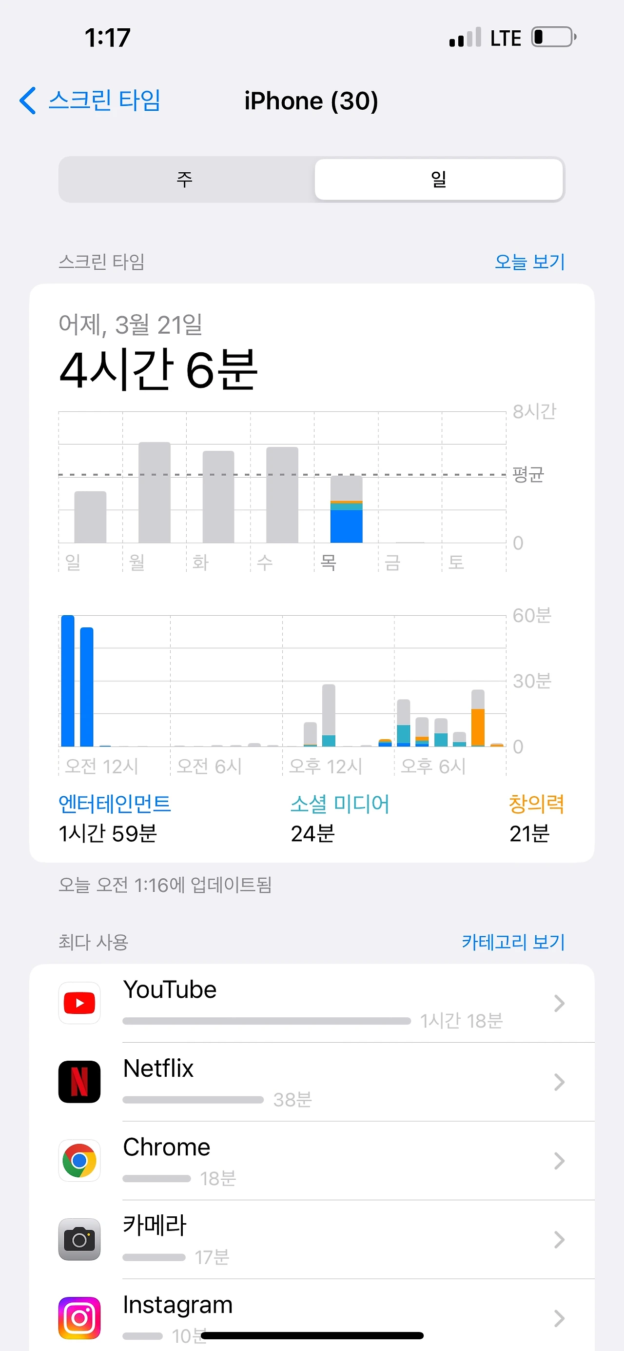 오늘은 도파민 디톡스 1일 차이다. 어제 새벽에 유튜브와 넷플릭스를 2시간 동안 본 탓에 2시간이 추가되어 있다. 이것을 제외하면 오늘 유튜브는 2분, 인스타그래는 10분 사용을 했다. 유튜브 2분은 운동할 때 듣는 플레이리스트를 검색할 때 사용했고, 인스타 10분은 DM 답장을 위해 사용했다.