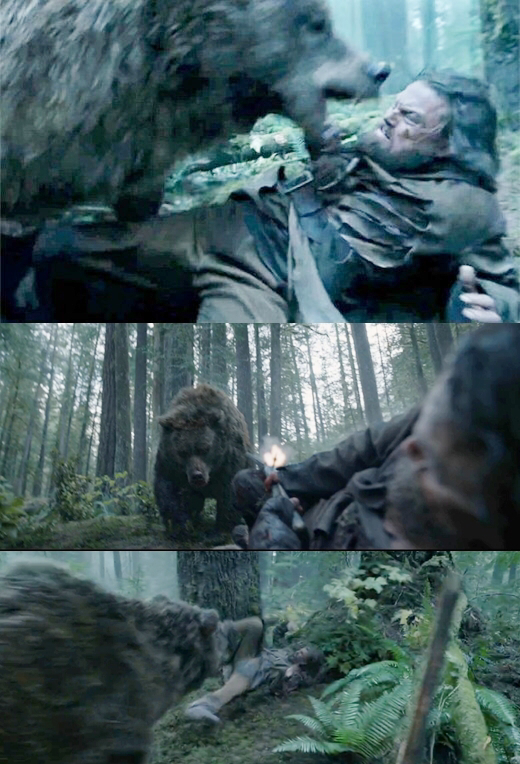 영화에서 휴 글래스를 연기한 배우는 레오나르도 디카프리오다. 서구인의 외모를 한 휴 글래스는 원주민 사이에서 낳은 아들 '호크'를 데리고 다니는 아버지이다. 동료들은 그런 그를 의심의 눈초리로 본다. 몰살당한 원주민 부족과 가족을 이루고 살았던 그의 과거를 캐묻고, 원주민 외모를 한 아들에게 '잡종', '짐승은 짐승이다'라며 모멸섞인 언사를 던진다. 이에 흥분하는 아들에게 아버지는 '저들은 네 말을 듣지 않는다, 유령처럼 살아야한다'며 머리채를 붙잡고 화를 낸다. 그가 그렇게 화는 내는건 피부색만 보는 동료들 사이에서 유색인종인 아들을 지키고 싶기 때문이다. 그런 아버지 글래스가 돌연 사고를 당한다. 광폭한 회색 곰을 만나 온 몸으로 맞서 싸운 것이다. 이 곰은 총에 맞아도 쓰러지지않는 괴물과도 같은 힘으로 그를 짓밟는다. 마치 인격이라도 있는 듯, 이 회색 곰은 자신을 쏜 글래스의 두번째 총탄에 더욱 격분하여 글래스를 물고 그의 살을 찢어발겨 흔들어놓는다. 제새끼를 지키려 온 힘을 다해 죽이려드는 집채만한 곰을 누가 당해낼 수 있을까. 글래스는 목소리조차 나오지 않는 으스러진 몸으로 동료들에게 발견되고, 결국 버려지게 된다. 동료 '피츠레럴드'에게 아들이 살해당하는 장면을 지켜보면서.