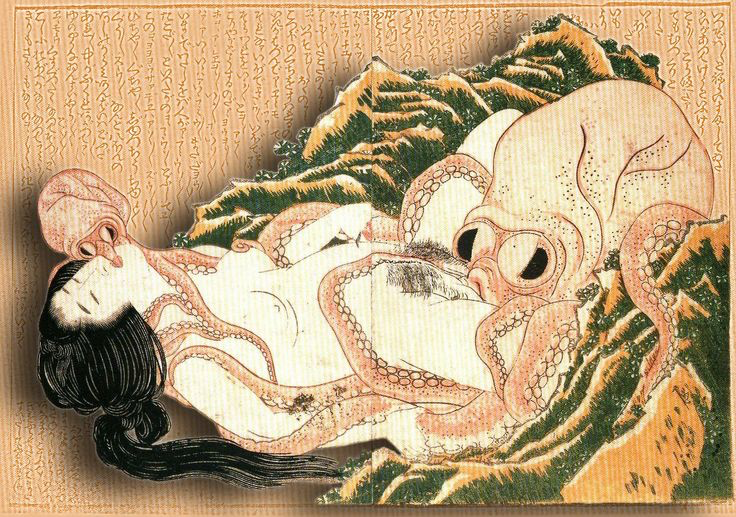 [어부 아내의 꿈](1814)와 <아가씨>포스터, 서로를 움켜쥔 손가락이 촉수의 은유처럼 보인다.