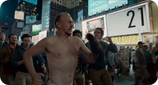 하늘로 날아오르던 리건은 추락한다. 유명 무비스타가 하얀 팬티바람으로 거리를 활보하게되는 우스꽝스러움으로, 평론가의 혹평에 괴로워하며 의미있게 간직하던 레이먼드 카버의 냅킨 메모를 내버리고, 하늘을 날아오르다가 다시 자신의 작품이 걸린 극장으로, 자신의 위치로 되돌아 와 하강함으로, 관객 앞에서 자기 자신을 총으로 쏴 버림으로써 그는 온몸으로 추락을 견뎌내고 통과한다. 리건은 공중에 붕 떠있거나 하늘을 날아오르지만, 사실 영화 내내 그리고 있는 리건의 모습은 추락하는 과정이나 다름없다. 그 추락의 비범함이 대중의 핸드폰에 고스란히 저장되고, 미디어가 기억해줄때에야 리건은 재고될 수 있는 것이었다. '남들이 어찌 평하느냐가 아닌, 실제로 무엇이냐가 진실이다(A thing is a thing, not what is said of that thing).'란 메모가 붙어있던 거울 앞의 리건은 타인의 이런저런 평이 만든이 그 프레임을 깨부수로 나감으로써 진실을 향해 날아갈 수 있었다. 버드맨이 아닌 진짜 새처럼 창밖으로.