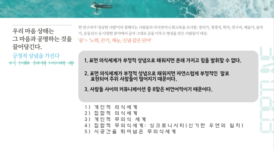 우리는 표면 의식세계를 긍정적인 상념으로 채우려고 한다. 요즘 매일 확언을 읽고 쓰면서 본인에게 주입을하고 있다.