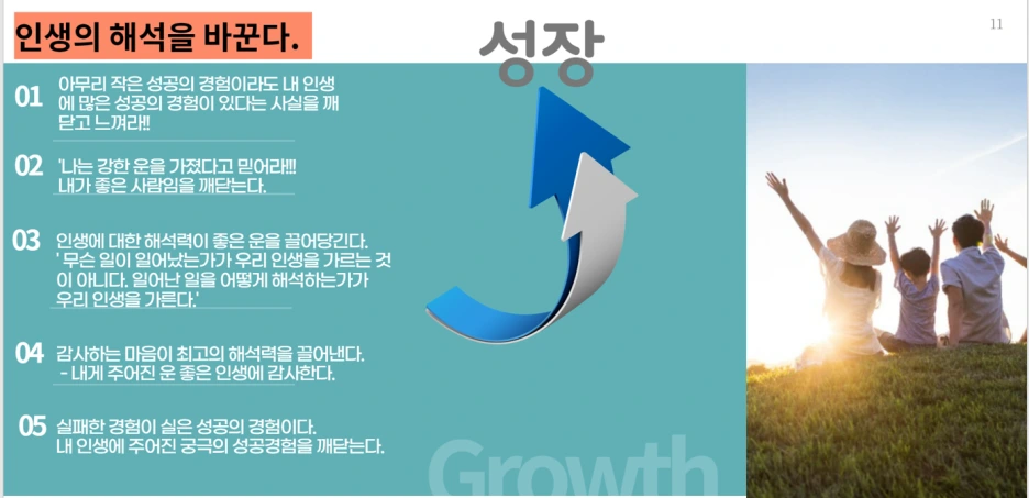 아무리 작은 성공경험이라도 내가 했다는 사실을 느끼고, 강한 운이 있음을 믿어라. 이 해석력은 감사할 때 최고조에 이른다. 실패한 경험조차도 성공경험의 일부이다.