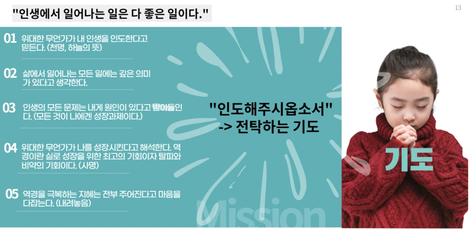 인생에 일어나는 무슨 일이든 다 나에게 좋은 일이며, 내 인생을 인도하기 때문이다. 역경도 선물이고 나를 성장시키기 위한 최고의 기회이다. 또한 역경을 극복하는 지혜조차도 내 안에 있기에 우리는 '인도해주시옵소서'라고 내맡기자. (~~해달라는 기도는 구걸이며, 내가 부족하고 결핍되어있다는 고백이다. 이미 채워져있고, 좋은 것들로 인도해주신다는 믿음으로 내맡기자.!!)
