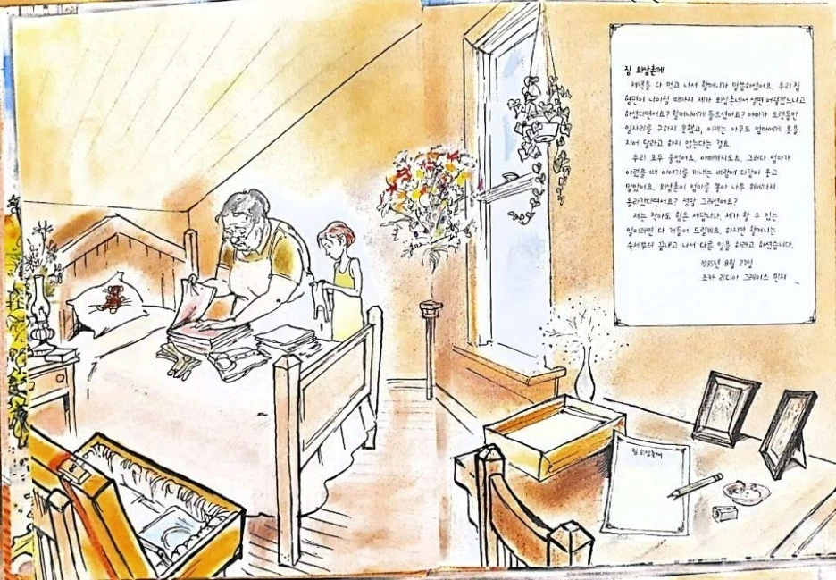 그림책 첫 장에 실린 편지를 읽고 솔직히 가족들에게 드리운 그림자가 무거워서 짠했다.