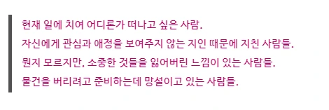 가난한 유년시절 형제끼리 나눈 추억, 아이들 위해 고단한 몸이면서도 뭔가를 만들어 주시던 엄마의 정성과 사랑, 나를 좋아해 사귀자는 말조차 못 하고 표시 나지 않게 챙겨주던 타인의 배려, 반짝반짝 눈이 빛나도록 하고 싶었던 꿈 등을 잃어버렸다. 대신 사귀자는 말조차 거부하도록 냉정하게 거절해서 상처 받았던 타인들의 고통, 깨달음의 길을 가겠다고 늦은 나이에 출가를 결심한 분의 진심을 혹독하게 비난했던 나의 말들, 꿈보다는 안정적이고 길게 갈 수 있는 직장을 가치로 두었던 나의 어리석음 등이 남아 나를 이끌고 있다.