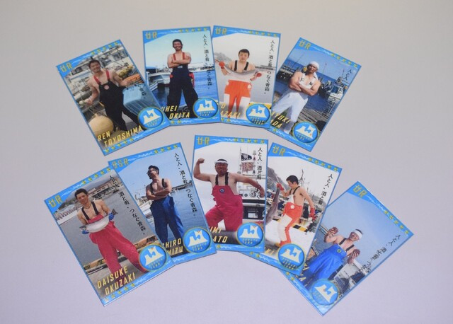 카드에는 근육질 몸매의 어부들이 포즈를 취하고 희소성을 나타내는 별 표시도 있습니다. '어부 카드'는 수산물 판촉 행사나 박람회 등에서 고객들에게 배포됩니다. 현재는 60여 종의 카드가 제작되었습니다.