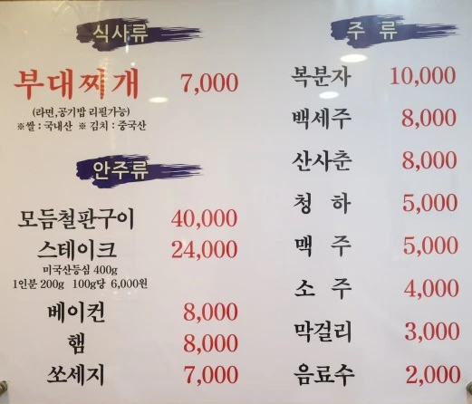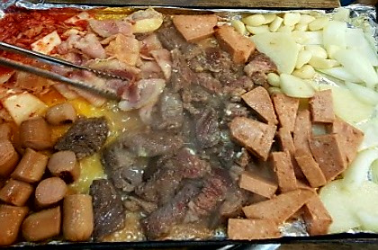 긴 철판에 은박지를 여러겹 얹고 버터를 슬슬 녹인다. 이후 김치, 햄, 베이컨, 소세지, 스테이크, 감자, 마늘 등을 굽는다. 머스터드 소스 기반의 특제 소스에 찍어먹으면 아주 별미인데..(칼로리는 책임질수 없다. 그야말로 guilty pleasure.)