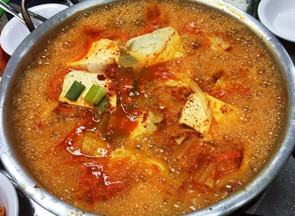 은근히 끓고있는 김치찌개 뚜껑 위에