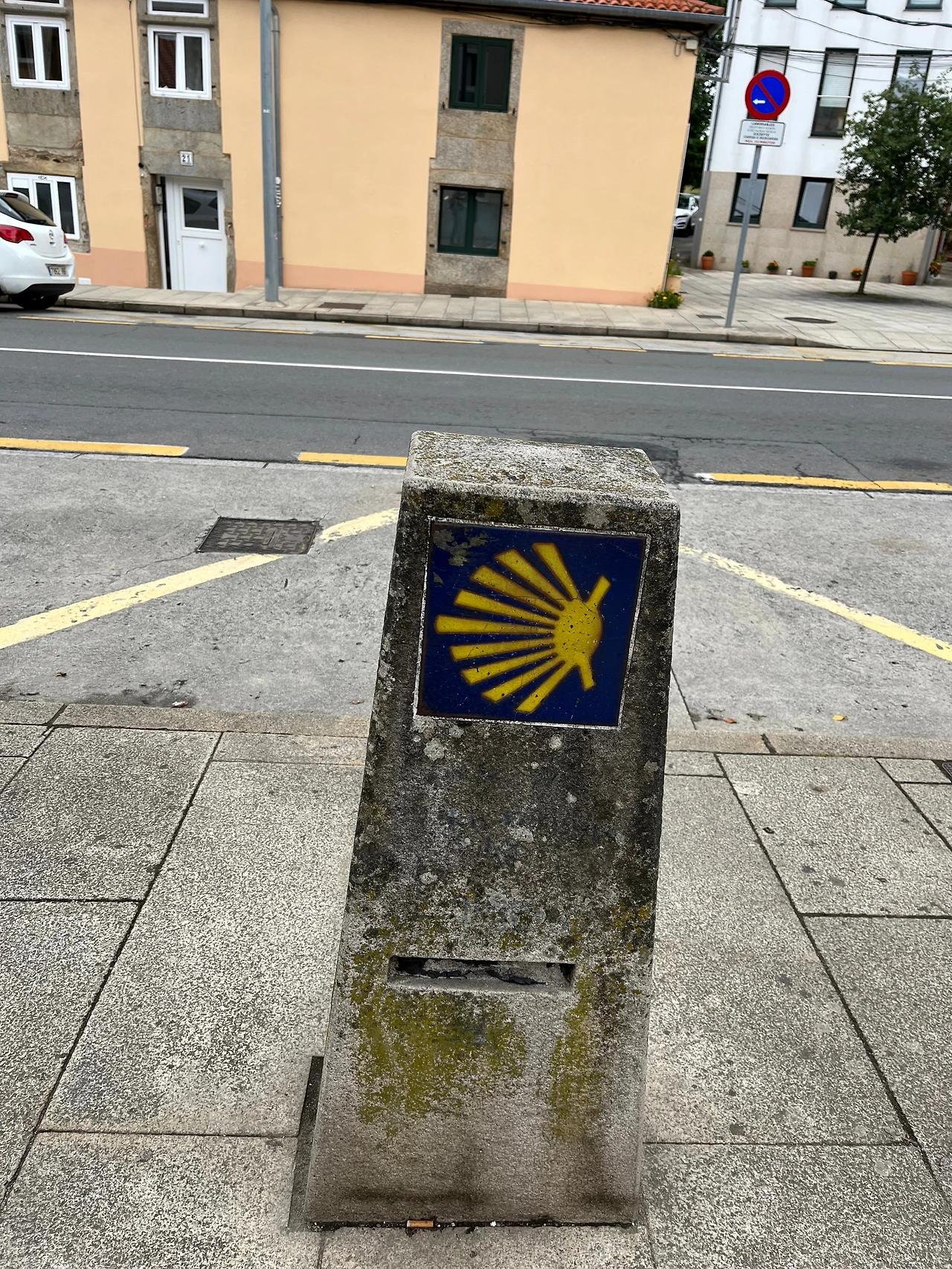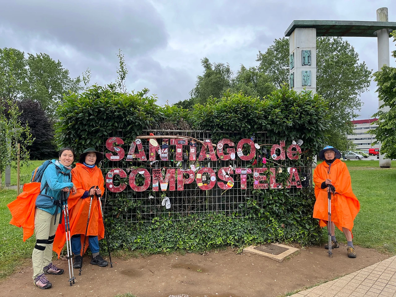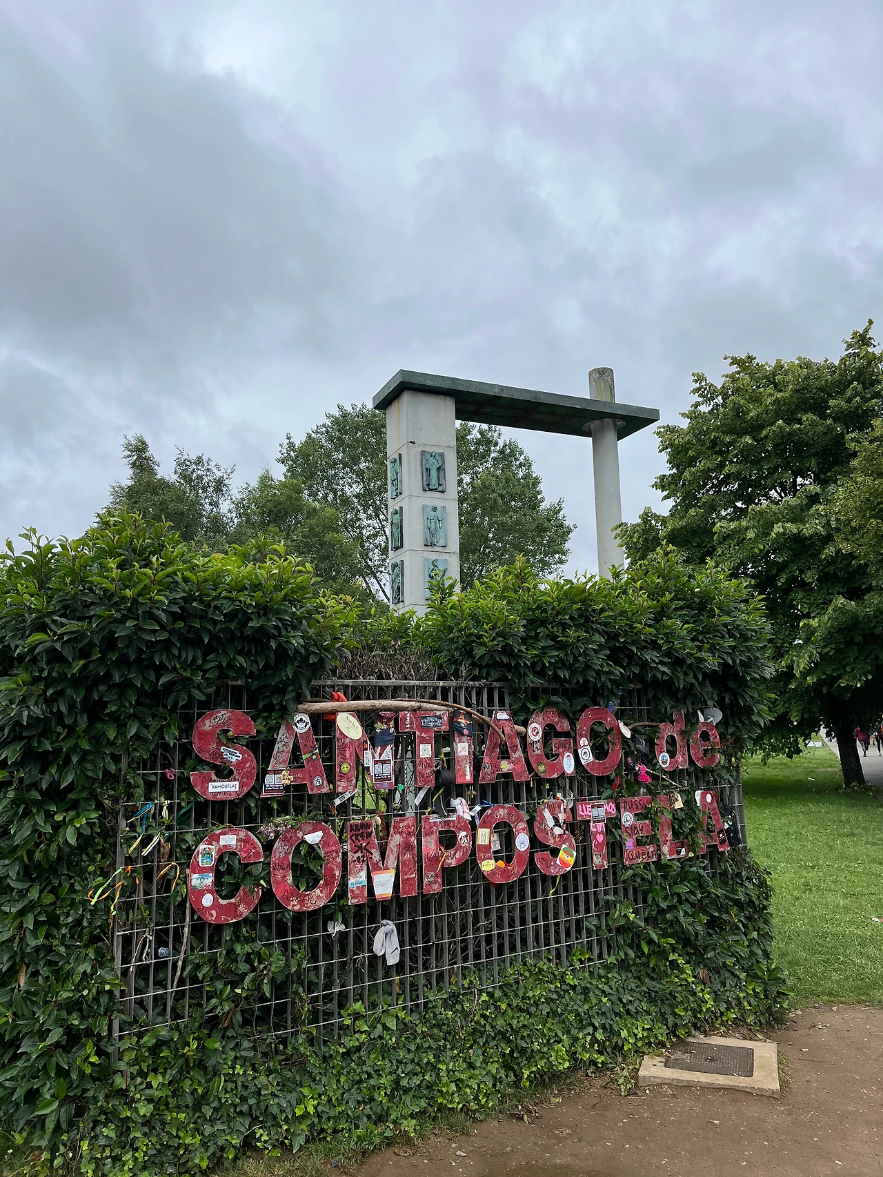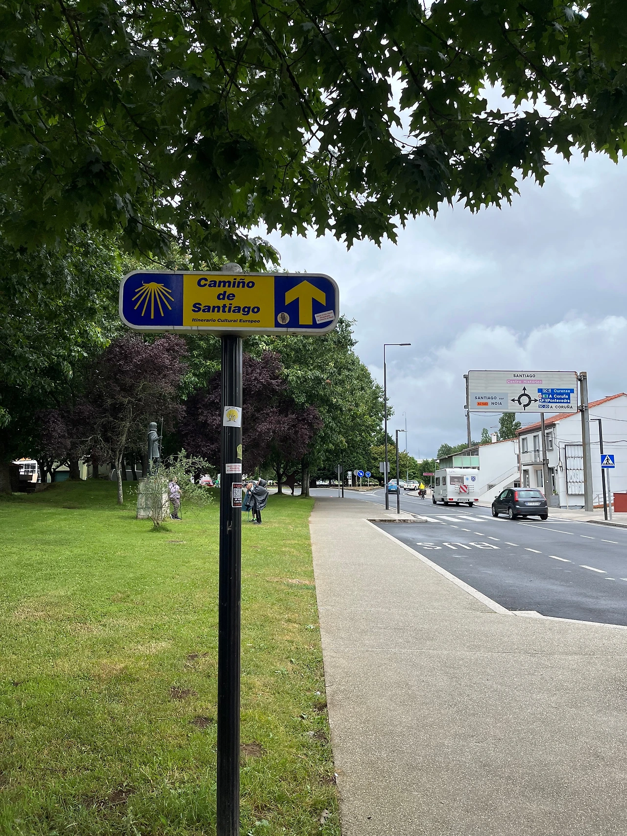 어느덧 산티아고 데 콤포스텔라 입구에 들어섰다. 구름이 잔뜩 끼었지만 비는 그쳤다. 도시로 들어오니 보도블럭으로 걸을 수 있어 걷기가 편했다. 비가 오면 아무래도 흙길보단 보도블럭이 나으니까. 물론 이곳에서부터 대성당까지는 한참을 걸어가야한다. 그래도 최종 목적지인 도시 입구에 들어섰으니 기념 사진 한 장.
