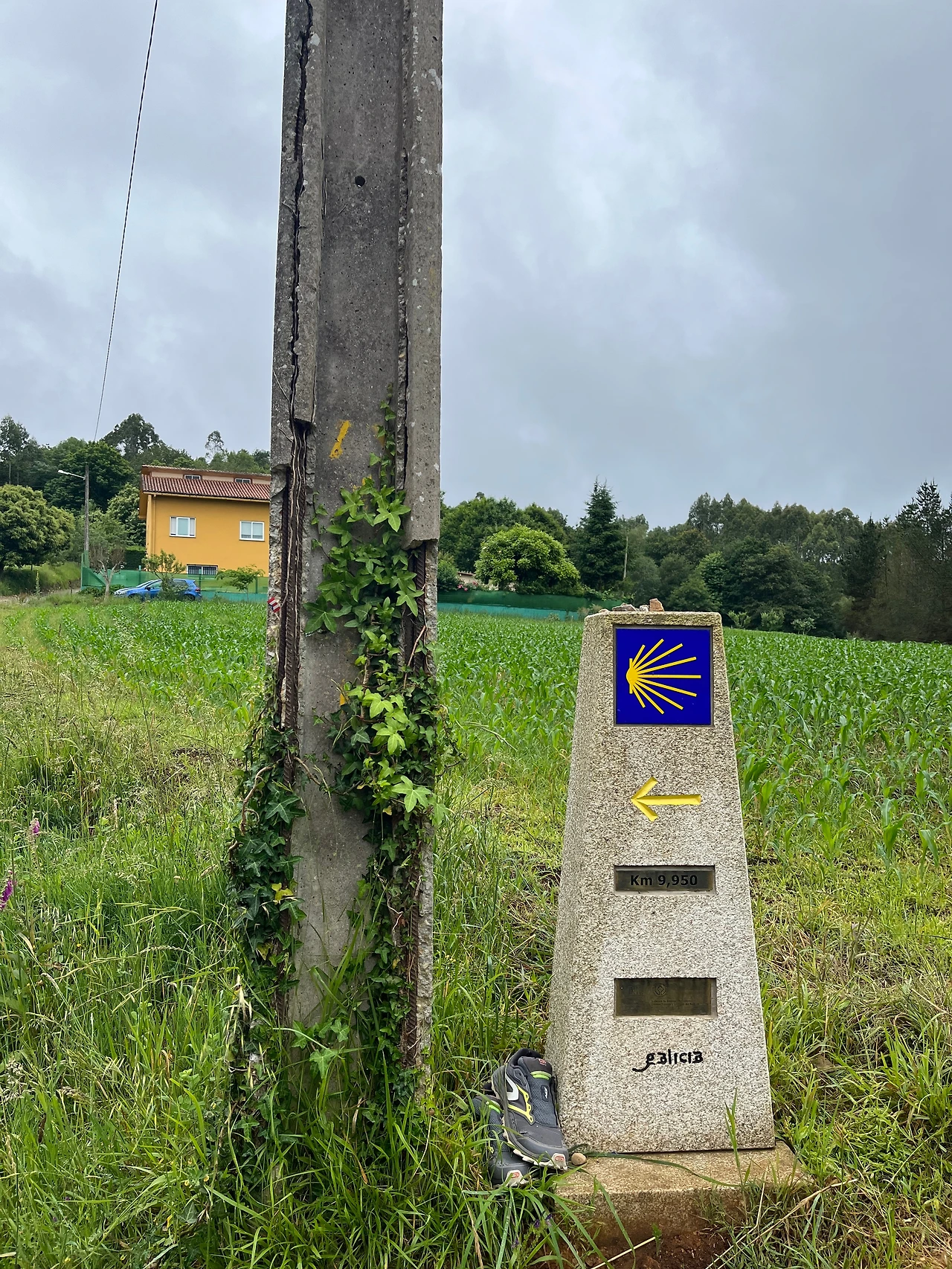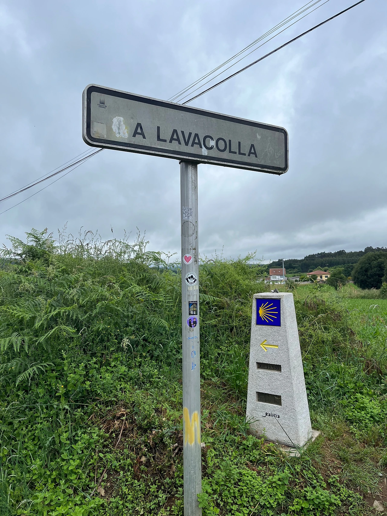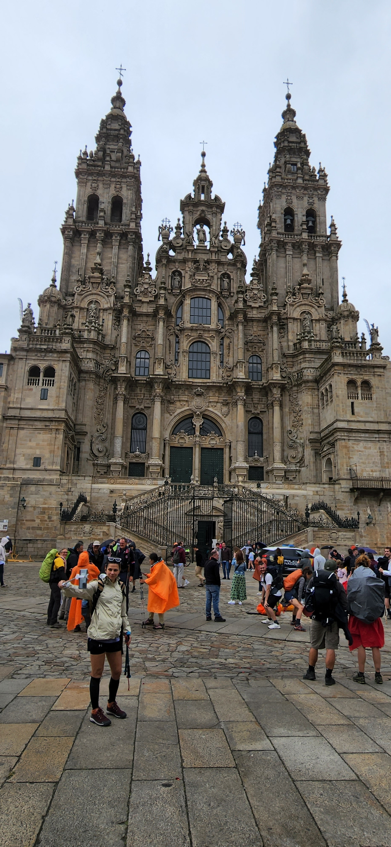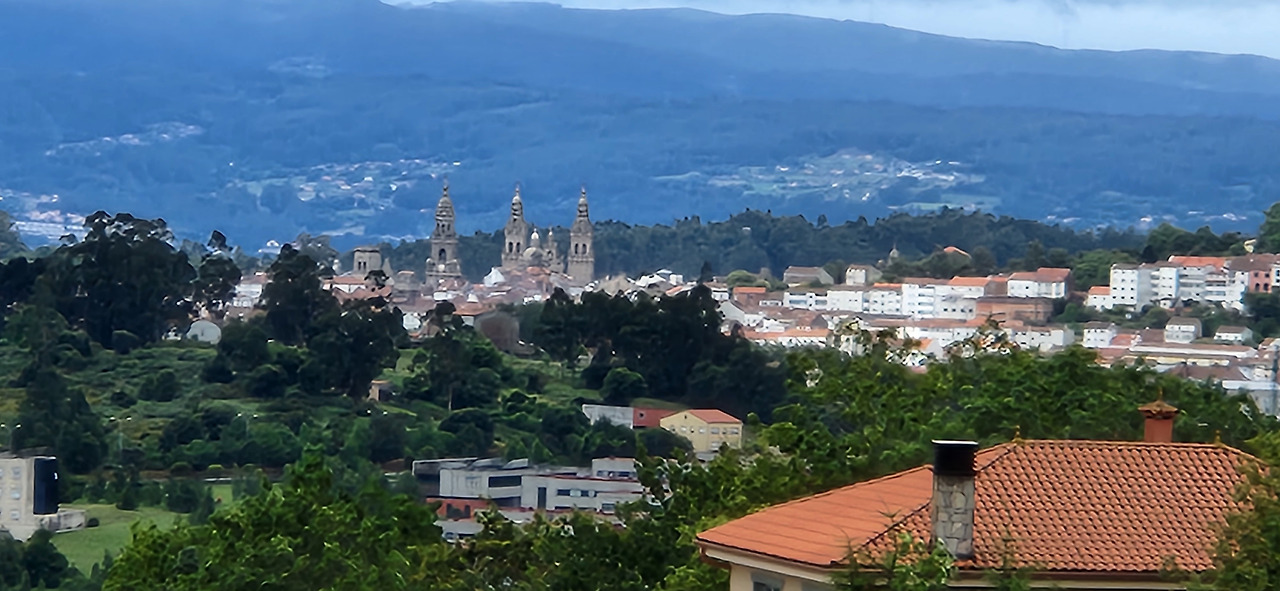 어느덧 산티아고 데 콤포스텔라 입구에 들어섰다. 구름이 잔뜩 끼었지만 비는 그쳤다. 도시로 들어오니 보도블럭으로 걸을 수 있어 걷기가 편했다. 비가 오면 아무래도 흙길보단 보도블럭이 나으니까. 물론 이곳에서부터 대성당까지는 한참을 걸어가야한다. 그래도 최종 목적지인 도시 입구에 들어섰으니 기념 사진 한 장.