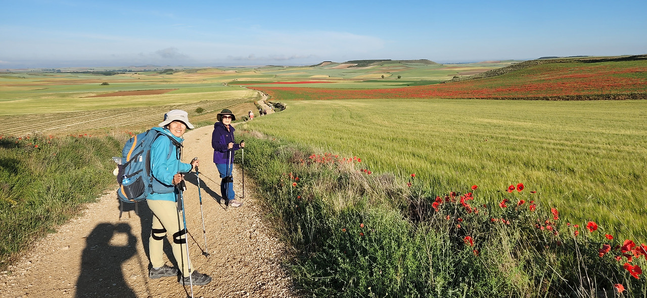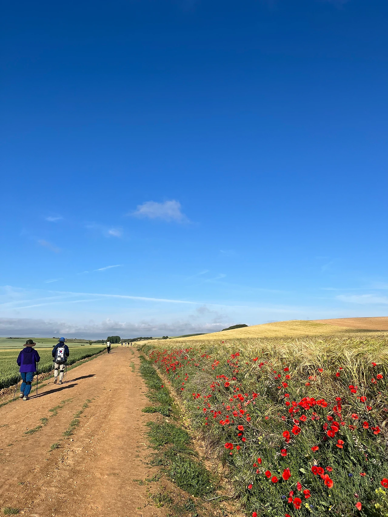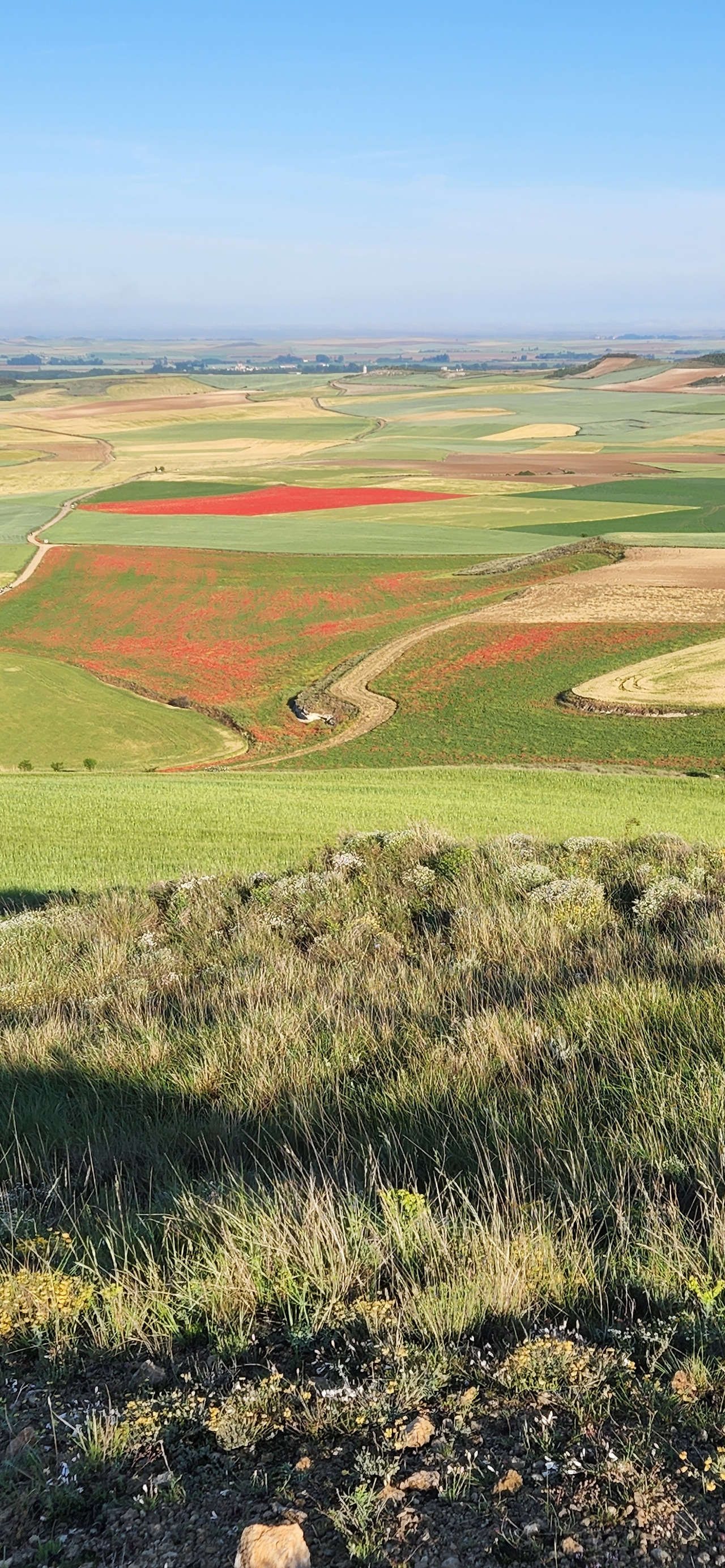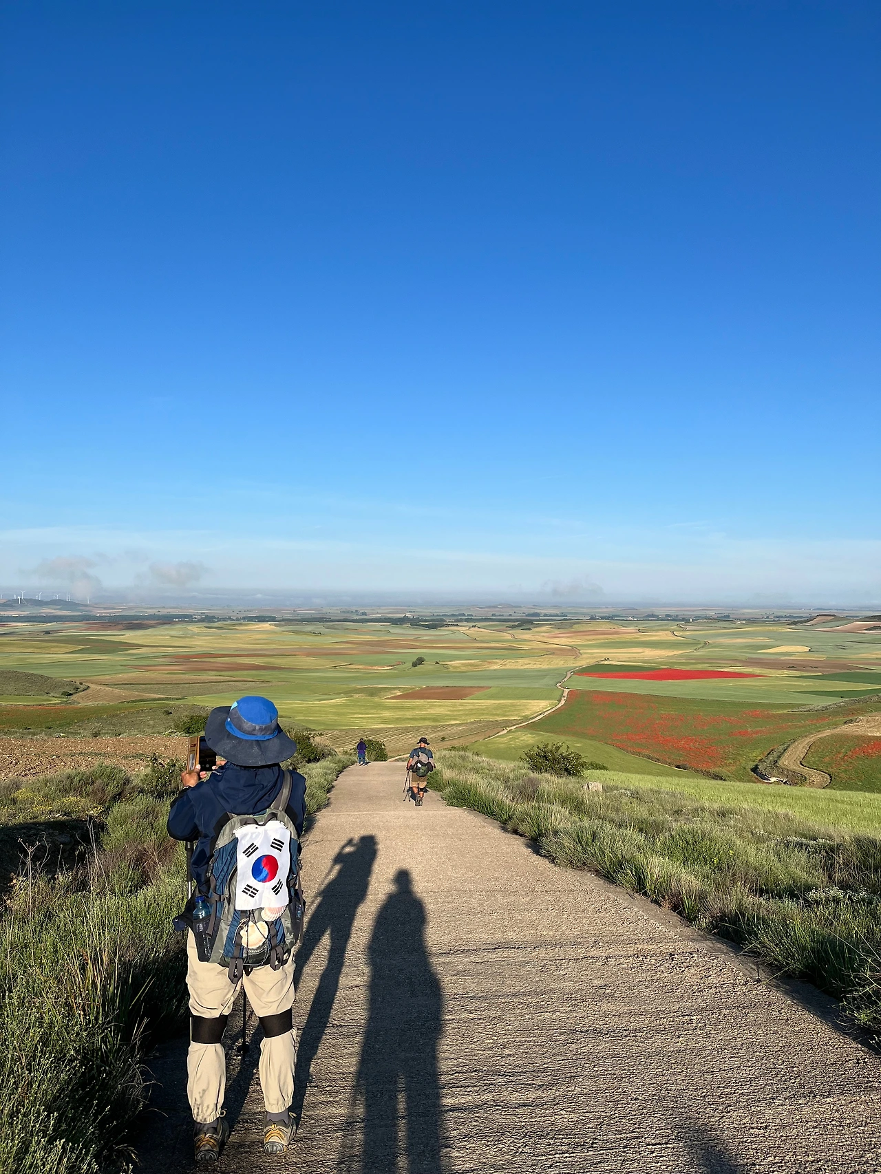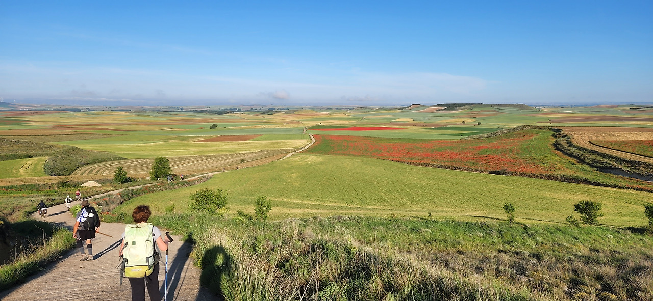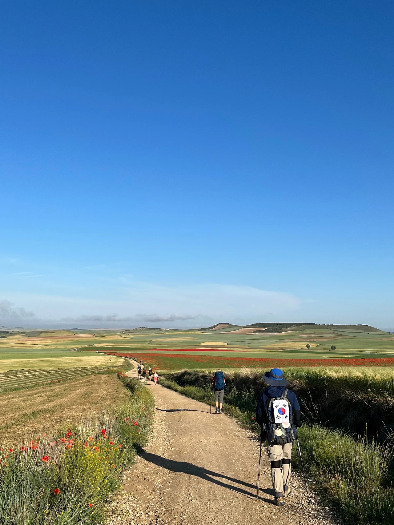 너른 들판의 초록색, 황금색, 빨간색이 눈을 사로잡았다. 그 사이에 작은 길이 멋지게 나있고, 그 길 위에 있는 순례자들의 행렬이 마치 개미군단 같았다.