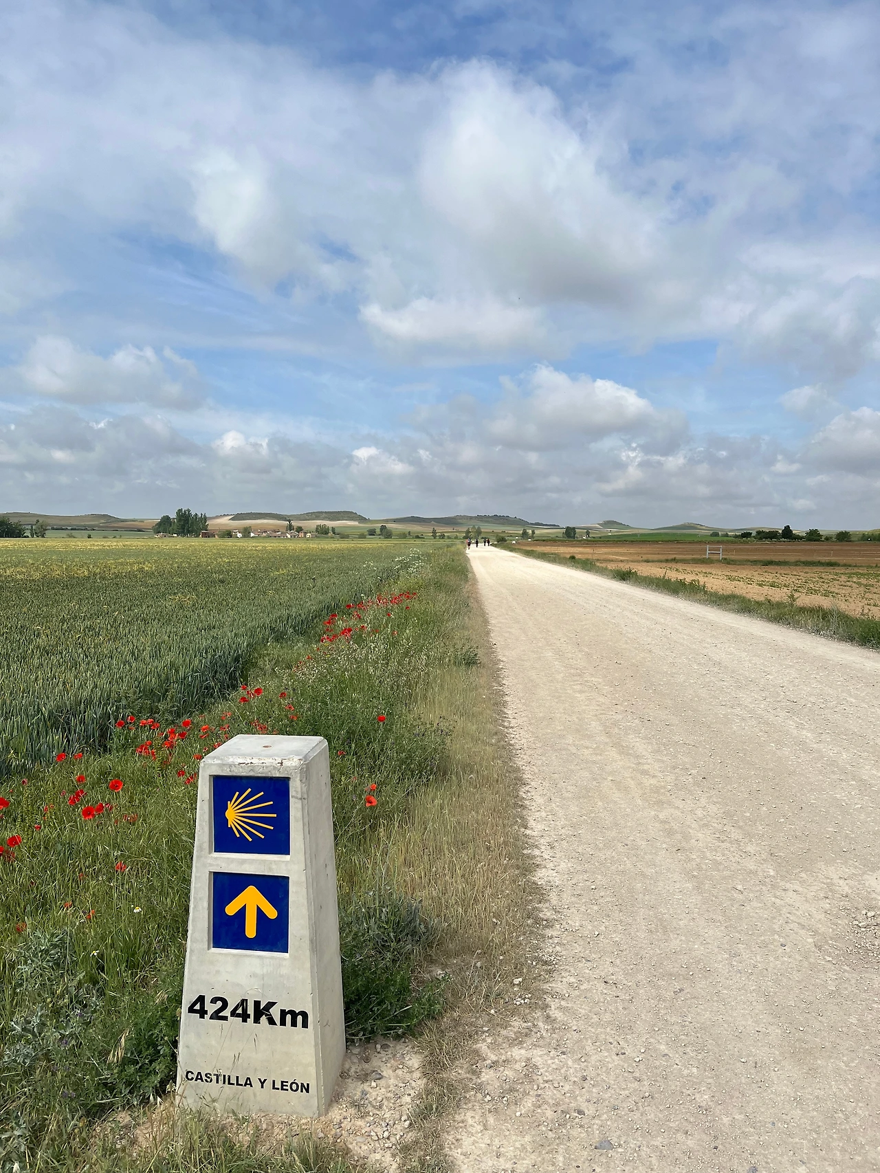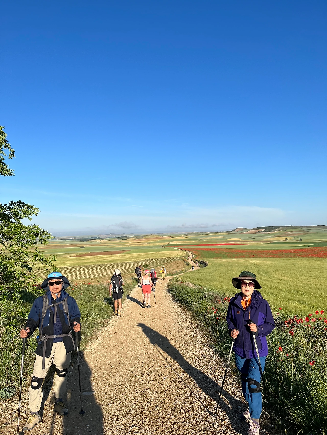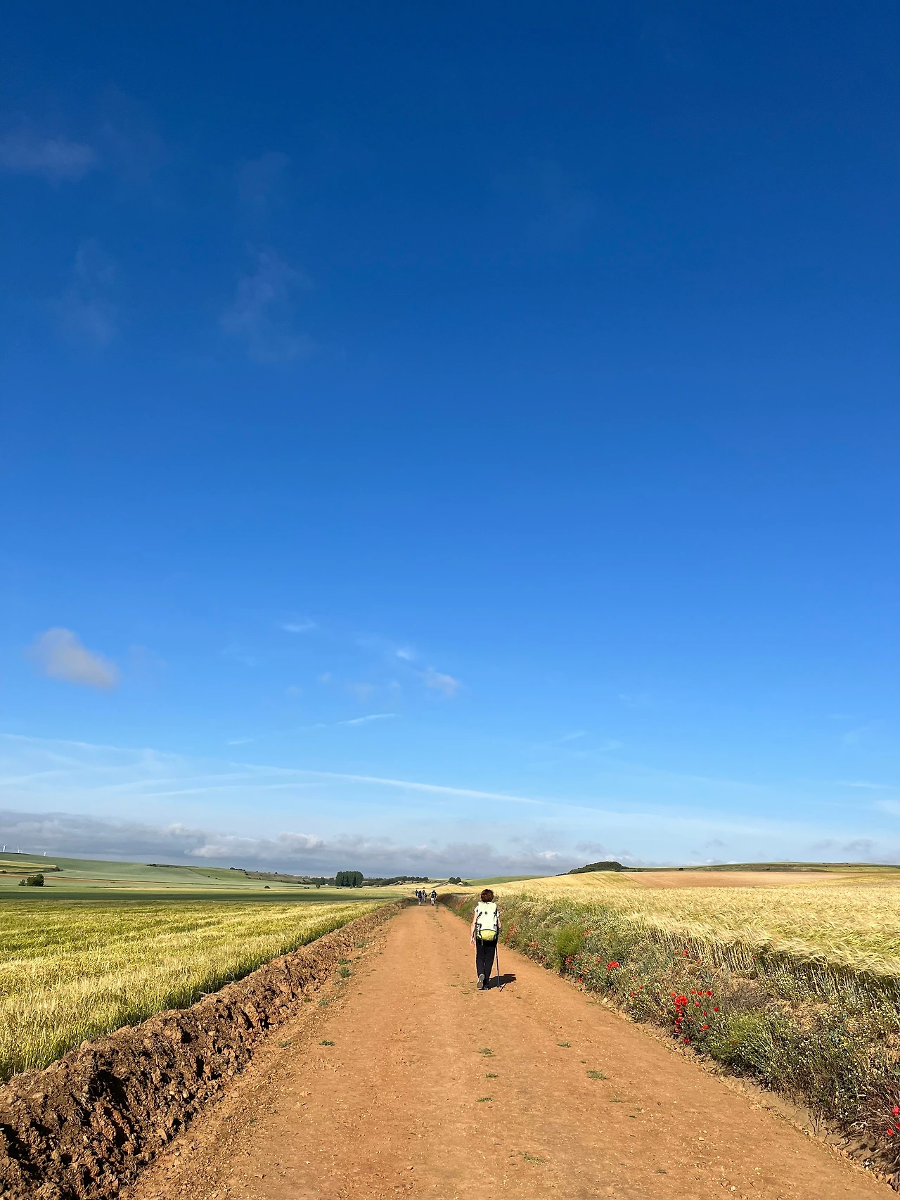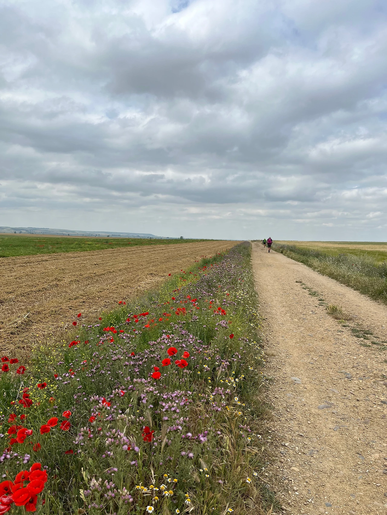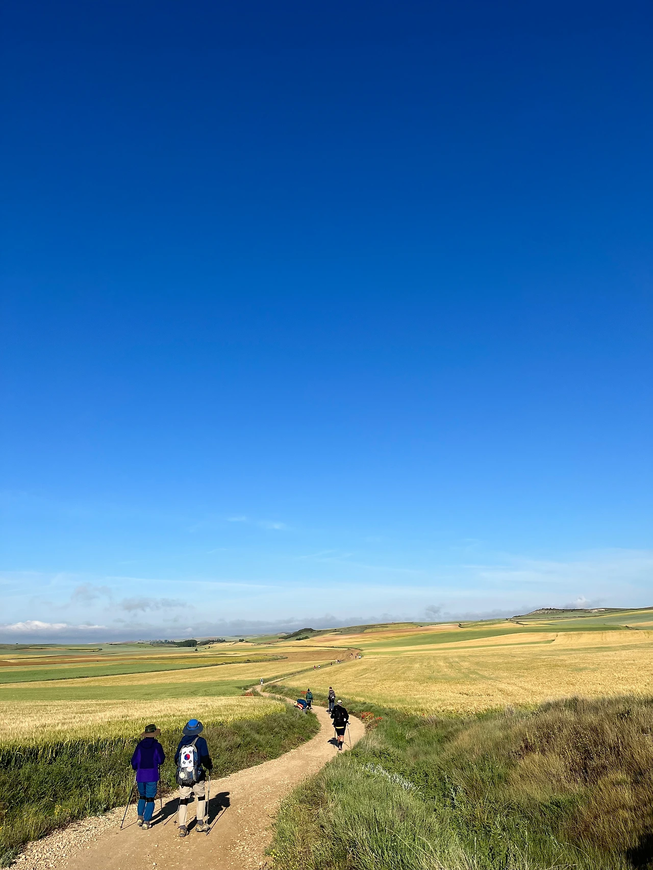 너른 들판의 초록색, 황금색, 빨간색이 눈을 사로잡았다. 그 사이에 작은 길이 멋지게 나있고, 그 길 위에 있는 순례자들의 행렬이 마치 개미군단 같았다.