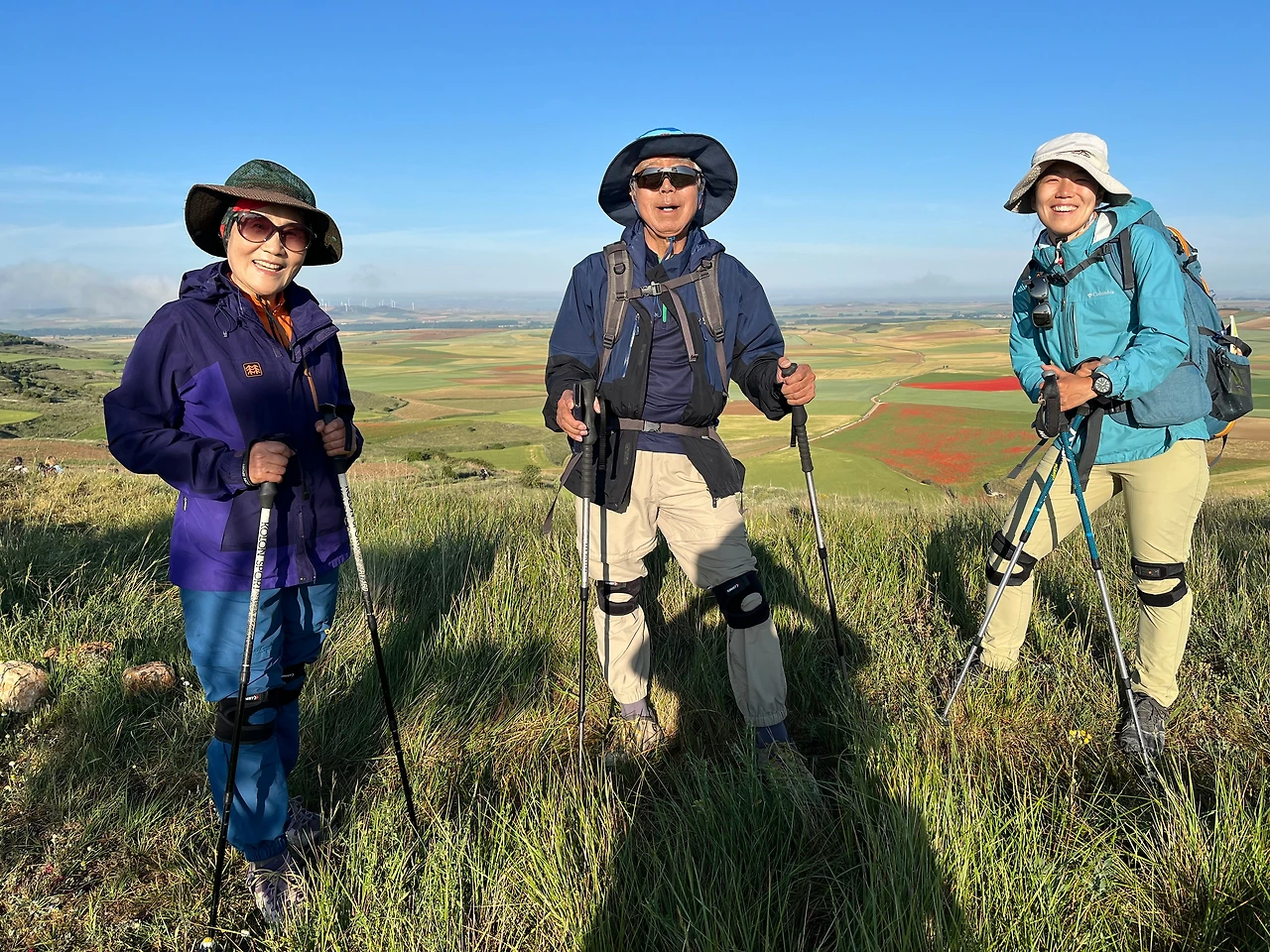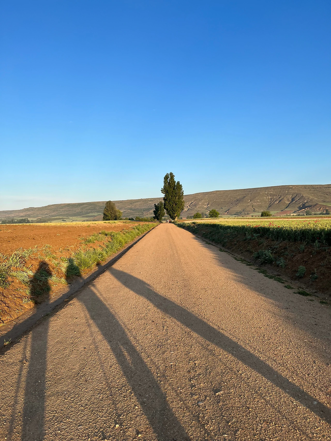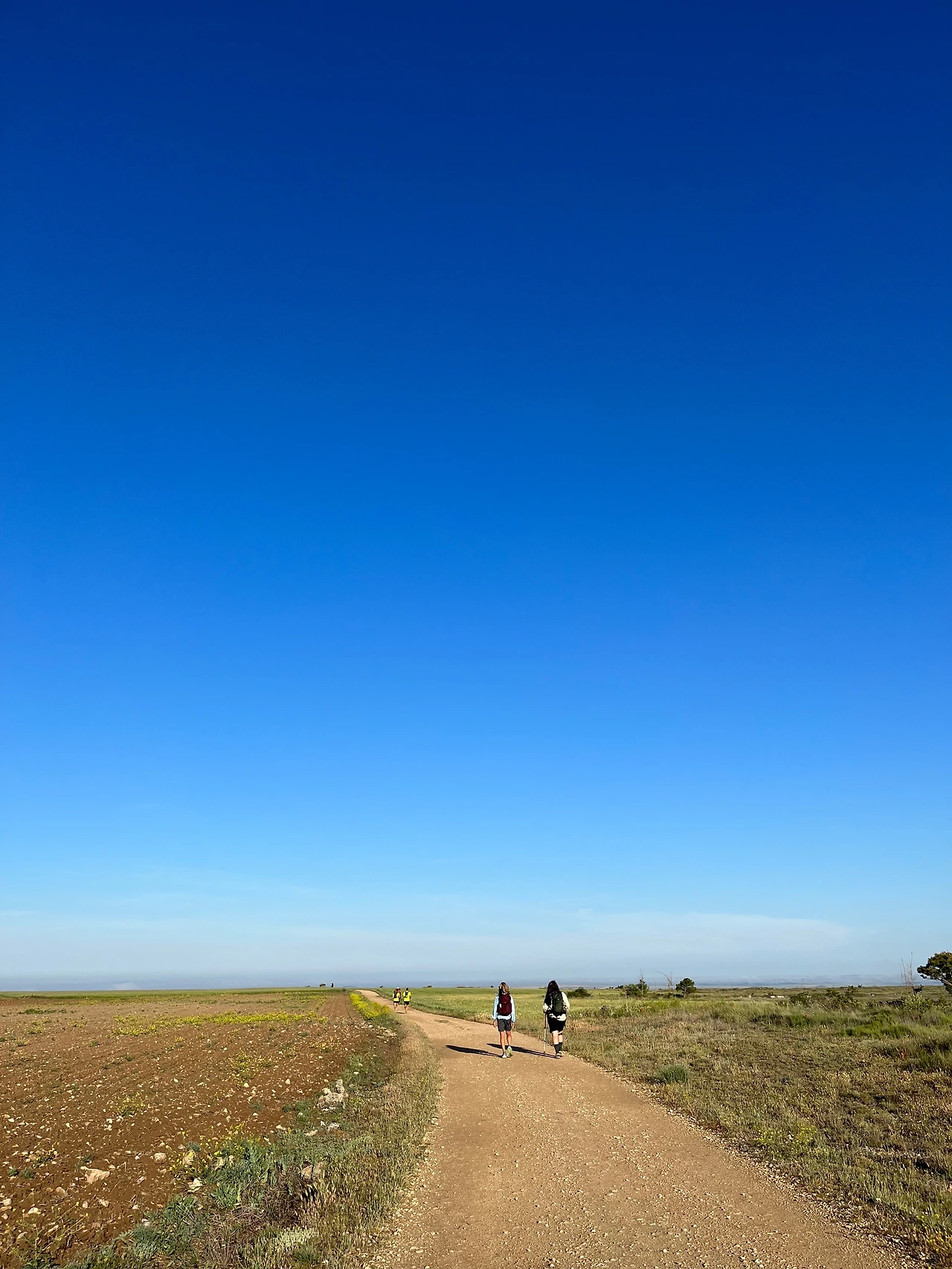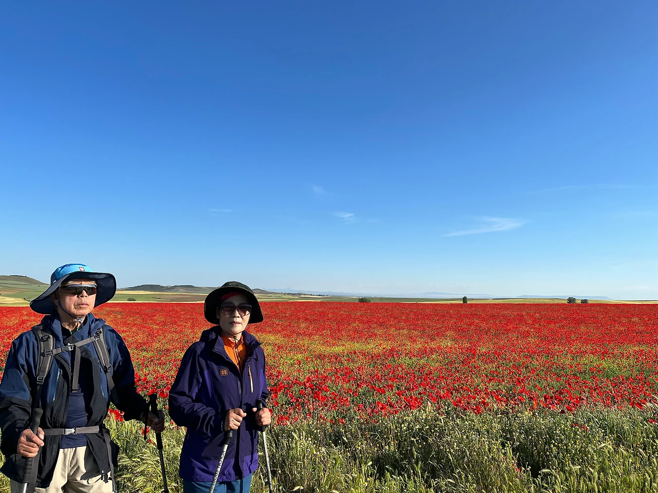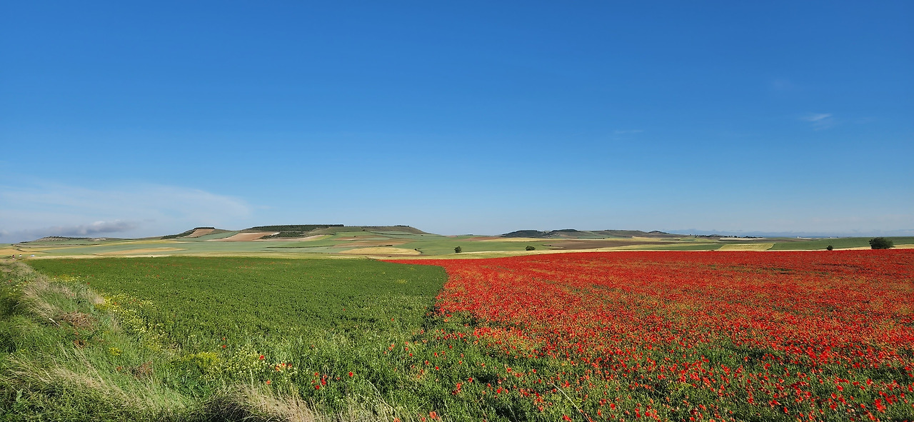 너른 들판의 초록색, 황금색, 빨간색이 눈을 사로잡았다. 그 사이에 작은 길이 멋지게 나있고, 그 길 위에 있는 순례자들의 행렬이 마치 개미군단 같았다.