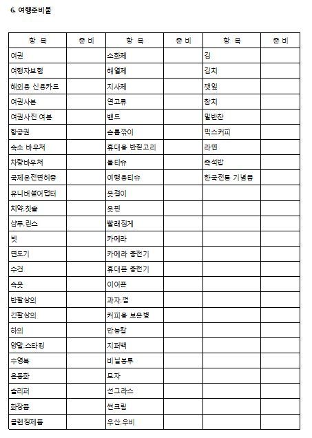 해외 유배를 당한 나 없이 엄마 아빠가 여행 짐을 챙기셔야 했기 때문에, 표로 체크하실 수 있도록 리스트를 짜드렸다. 현지에서 제 역할을 완전 톡톡히 해 낸 비장의 아이템은 "큰 보온병" 차량으로 이동하기 때문에 들고 다닐 때 무겁다는 단점을 보완할 수 있어서, 호텔에서 아침에 출발할 때 물을 팔팔 데워서 싸가지고 나오면, 이동 중간에 커피도 타마 실수 있고, 식당을 찾아 멈추기 애매한 곳에서 차를 휴게소에 세우고 컵라면, 컵밥 등을 해 먹을 수 있었다. 컵라면&여행용 김치는 중간중간 야외 휴게소에서 그간의 현지식의 느끼함을 달래주는 효자노릇을 톡톡히 했고, 즉석에서 커피도 샥샥 타서 마실수 있게 해 준 대형 보온병은 정말 렌터카 덕분에나 장착할 수 있던 아이템이다. 단! 컵라면 챙기실 때 나무젓가락, 커피 타드시고 싶다면 종이컵 잊지 마시길.