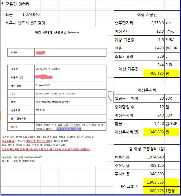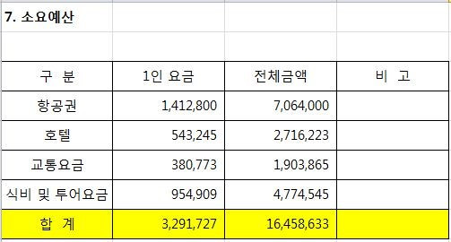 이렇게 저렇게 금액을 구별하여 우리가 뽑은 예상 경비!! 5인 여행의 전체 금액은 무려 16백만 원이나 든다.
