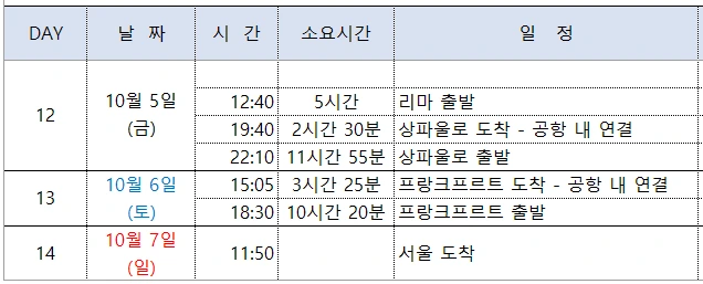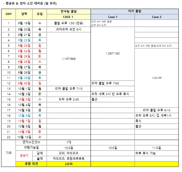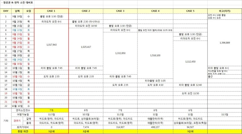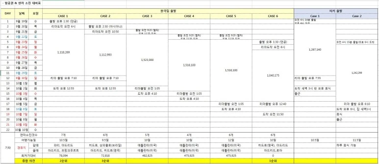 외국인 노동자였던(과거형입니다, 드디어 한국이에요!) 나의 경우 한 번씩 돌아오는 휴가가 2주쯤 되기 때문에 비교적 넉넉한 시간이 있지만, 한국에서 일하는 아빠, 아저씨, 이모의 경우 너무 긴 휴가를 낼 수는 없었다. 한국에서 페루까지 가려면 적어도 오가는 길에 3-4일 정도의 시간을 써야 했고, 아무리 회사에 배 째라 내공을 지른다 해도 한계는 분명히 있었다. 그래서 최소한의 투자(연차)로 최대한의 효과(여행기간)를 내기 위해 추석 연휴에 휴가를 붙여 가기로 했고, 우리가 생각하는 기간의 앞뒤 시간을 분석해서 Case표를 만들었다. 소요되는 연차와, 실제 여행이 가능한 날의 수, 경유해야 하는 횟수를 정리했고, 연휴 전후임을 감안할 때 출발일을 조정하며 항공료가 가장 저렴한 날짜를 찾았다.