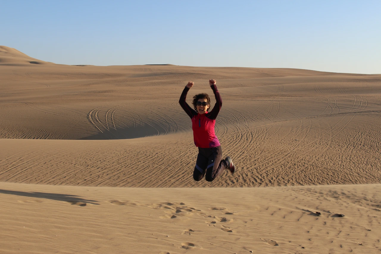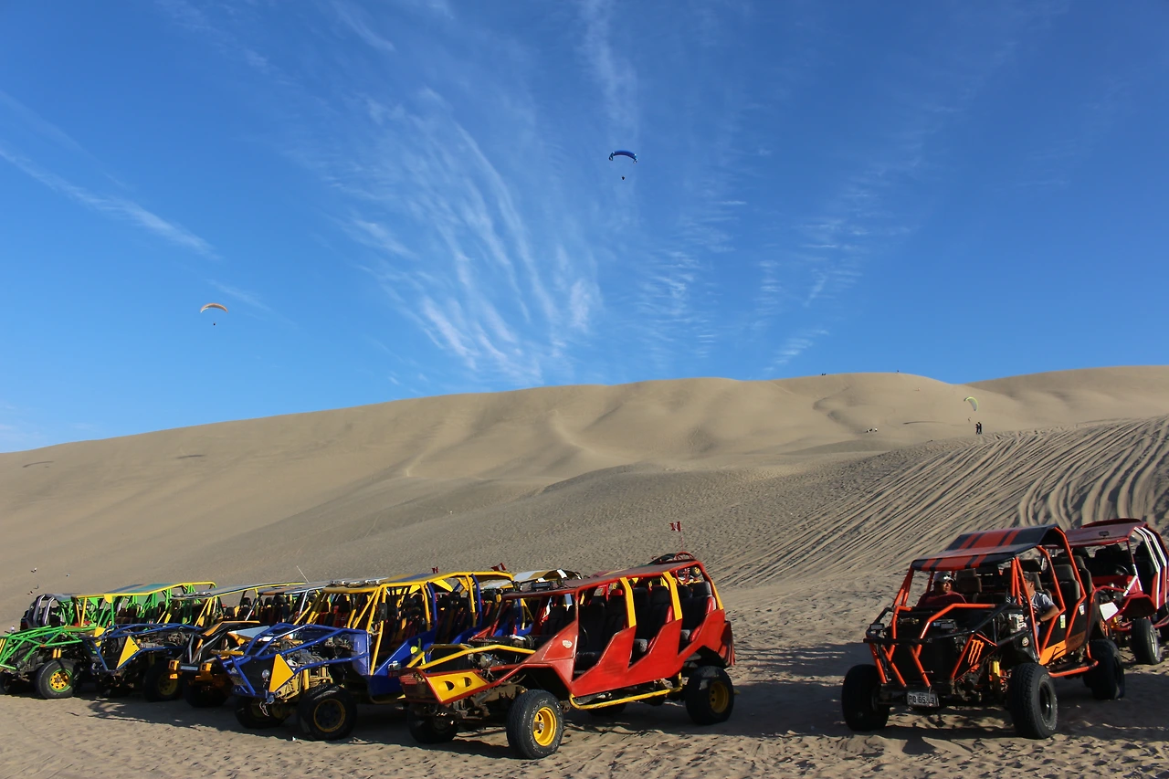 드디어 사막의 입구에 들어섰을 때! 숙소 뒤로 조금 걸어 올라가자 나오는 사막의 입구만 보았을 뿐인데, 그러니까 아직 인공적인 오아시스도 좀 껴있고, 투어 회사의 버기 차량도 잔뜩 있어서 완전한 사막의 실체를 만나기도 전인데 엄마아빠이모아저씨의 표정이 대단하다. "와.....", "이야.....", "허허허...." 이런 감탄사가 쏟아져 나오는 걸 보면서 으쓱한 것은 나의 몫. 하늘은 새파랬고, 사막은 말 그대로 끝이 없었고, 하늘에선 사막의 기류를 타고 오르락내리락하는 패러글라이딩 라이더들이 바람을 타고 있었고, 알록달록한 버기카들이 새로 오신 손님들을 태우려고 대기 중이었다.