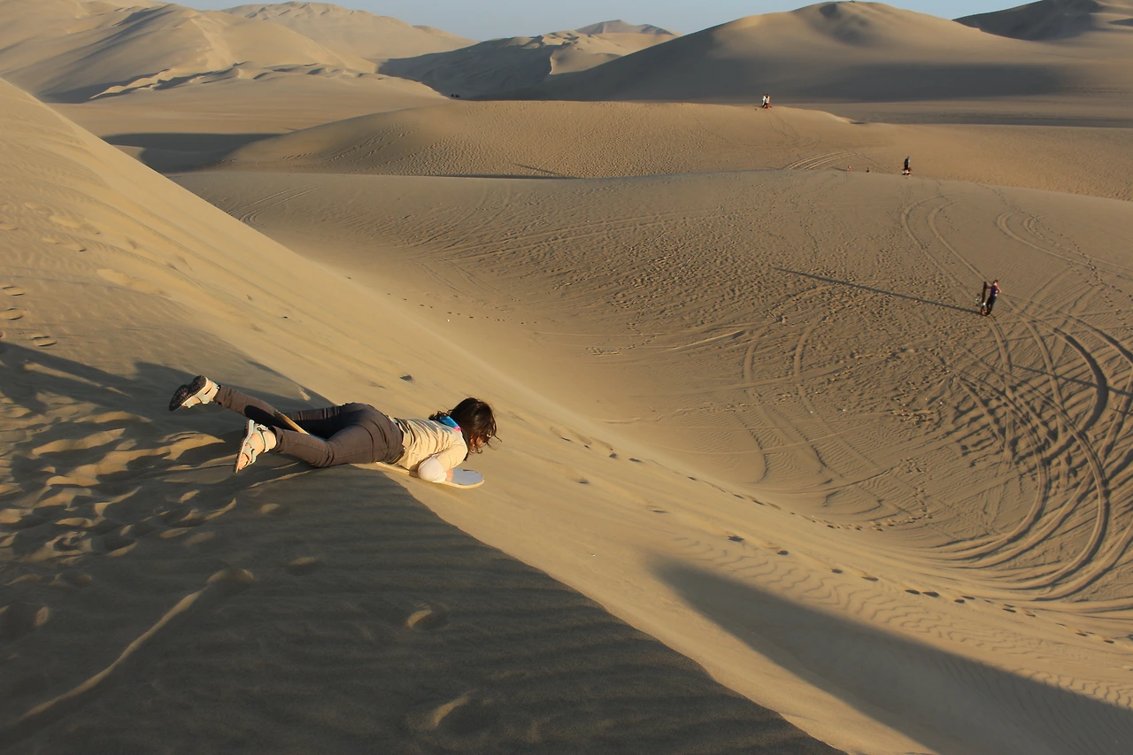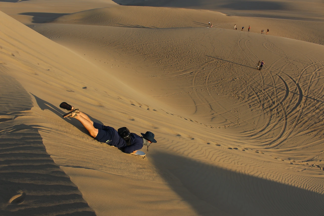 그렇게 한참 질주를 하던 버기카가 멈춰 선 곳은 샌드보드를 타고 내려갈 슬로프 앞. 그러니까 이 투어의 하이라이트인 샌드보드의 시간이다. 투어 회사에서 나온 버기카 드라이버들은 숙련된 눈썰미로 적당한 길이와 경사의 모래 슬로프들을 골라냈고 초급에서 연습을 하고 중급으로, 중급을 무사히 통과하면 고급으로 우리를 데려간다고 설명해 주었다. 보드판에 초를 칠하고, 자세를 어떻게 잡아야 하는지, 어떻게 정지하게 되는지 간단한 설명을 듣고 드디어 출발 자세를 잡는다. 가이드가 "Go"를 외치며 쭉 밀어주는데, 모래 위 썰매 타는 기분은 부드러운데 매끄럽고, 속도감도 있다.
