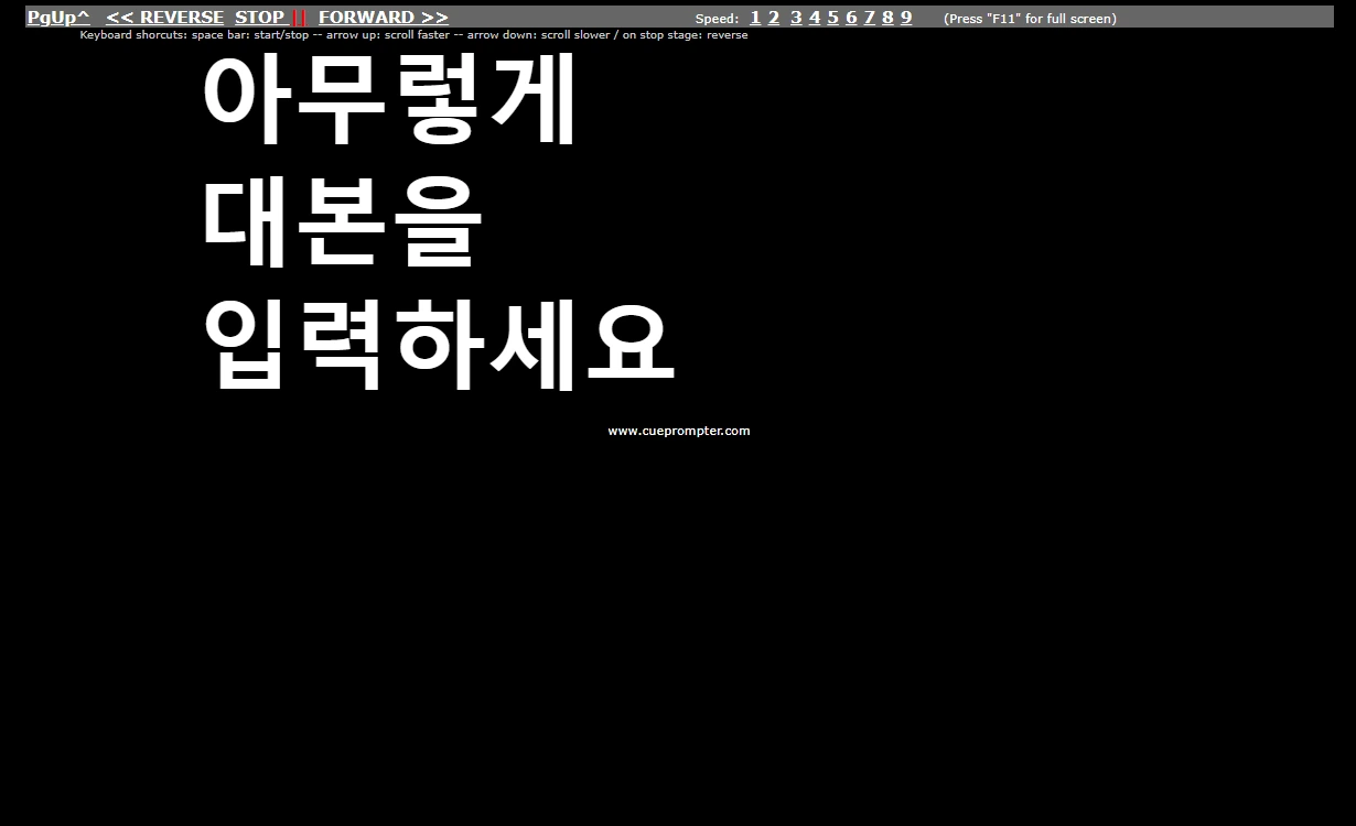 큐프롬프터(cueprompter.com)는 무료로 제공되는 웹 프롬프터입니다. 그냥 여러분의 대본을 붙여넣으시면 됩니다. 프롬프터가 실행될 때는 위아래 화살표로 속도를 조절할 수 있습니다.