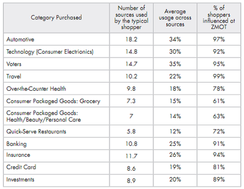 ZMOT는 여행, 자동차, 가격이 나가는 가전제품에만 일어나는 일이 아니다. 샴푸, 시리얼, 볼펜과 같은 일용품에서도 일어나고 있다. 당신이 혹시 피자 가게나 가전제품 가게를 운영하고 있다고 치면, ZMOT는 항상 중요한 요건 중 하나가 될 것이다. 그것이 사람들이 당신을 발견하는 경로이기 때문이다. 놀랄지도 모르겠지만, Google 검색의 20% 정도가 지역연계형 검색이다. 모바일 검색으로 치면 그 비율은 더욱 높아져 약 40%를 차지한다. Shopper Science 조사에 의하면, 다양한 영역에 있어서 ZMOT가 폭넓게 구입 의사결정에 영향을 주고 있음을 알 수 있다.