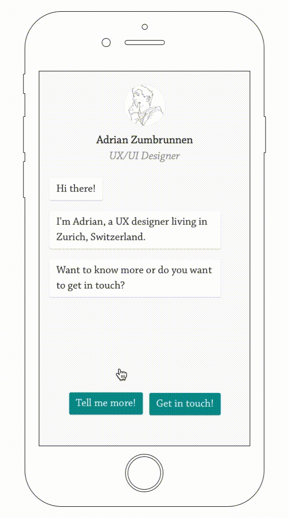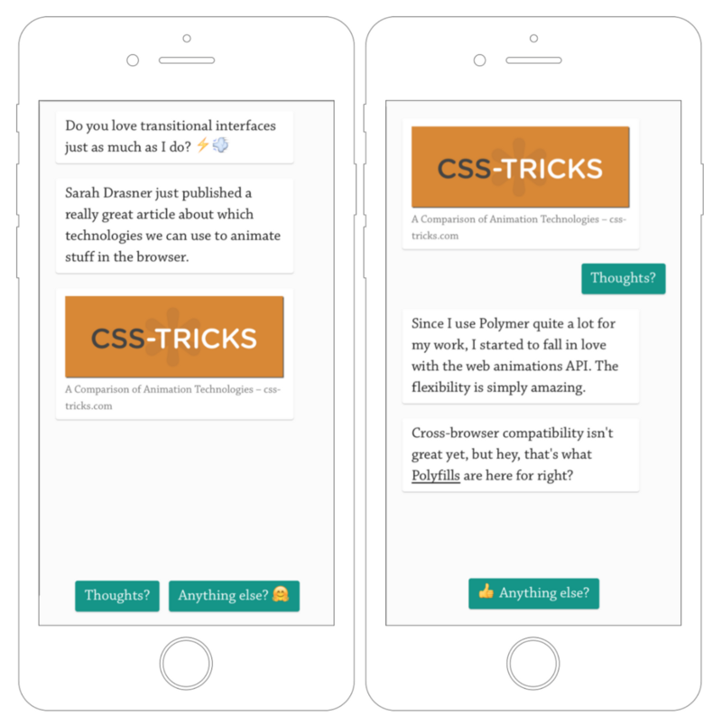 세 번째로는 애니메이션이 인터랙티브함을 강화해준다는 점입니다. 버튼을 갖고노는 듯한 느낌으로 약간 이동함으로써 시선을 끌게하며, 유저를 참견하고 싶게 만들 수 있습니다. 그리고 이번에는 버튼을 누르면 그 버튼이 그대로 답변으로써 메시지가 되도록 연출했습니다.