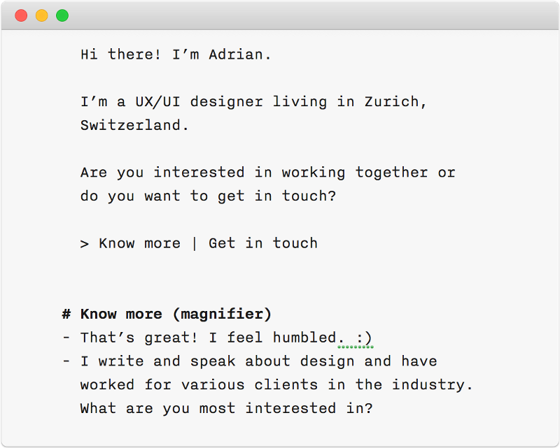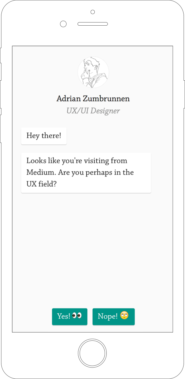 그래서 저는 이 문맥에 따른 대화법을 이번 체험에 담아내야겠다고 생각했습니다. 문맥을 이해하는 것은 대화가 흘러가는 방식을 크게 개선할 수 있습니다. 예를 들면 미디엄 또는 트위터에서 제 사이트를 방문하신 분들이 높은 확률로 디자인에 관심있다는 점을 알 수 있습니다. 그들은 트윗과 기사, 또는 기타 소스를 통해서도 알 수 있으니 다음과 같은 대화를 담아보았습니다.
