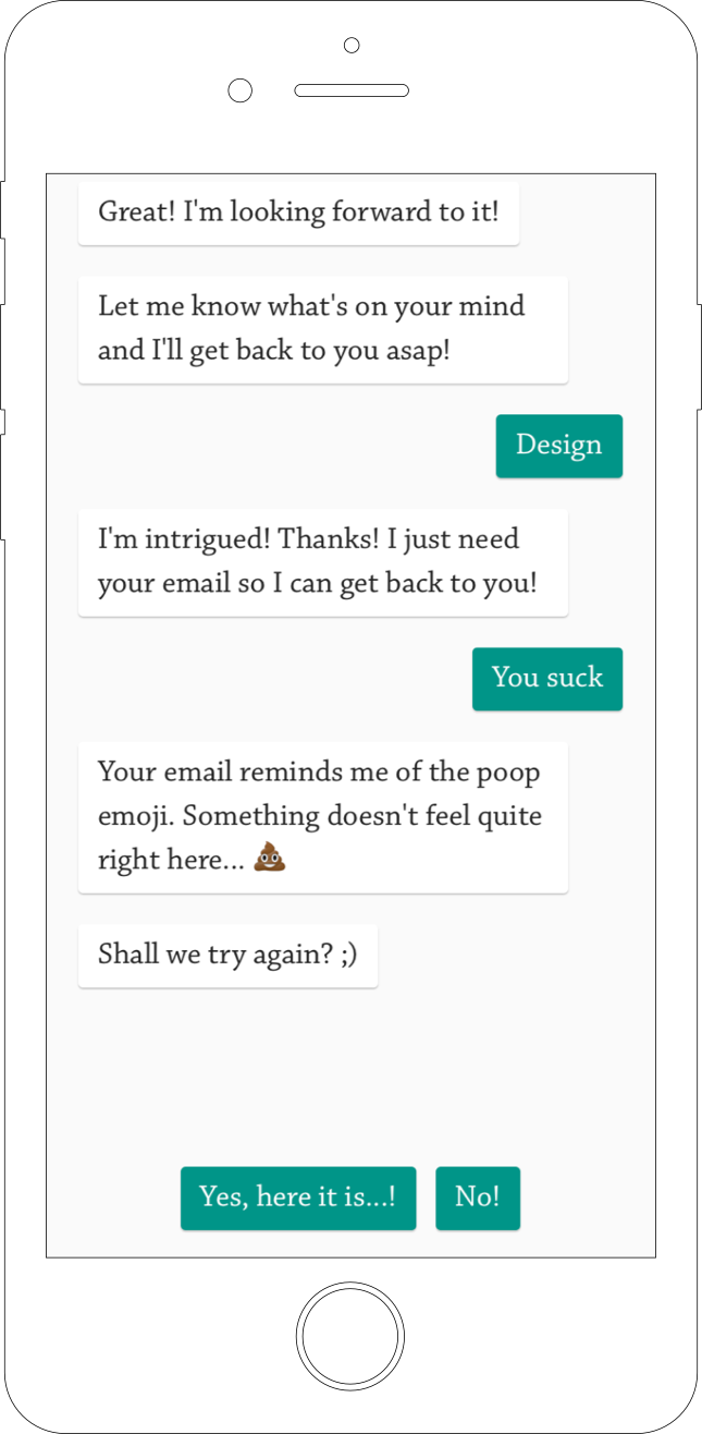 이번 실험적인 bot을 개발하며 깨달은 점이 있습니다. 사람들은 실제로 이것저것 bot을 만지작거리며 장난치는 일들도 시작했습니다. 이번에 하나의 목표로써 이 대화에서, 기존의 연락처 양식에 심리스하게 바꾸고 싶은 것이 있었습니다. "Get in Touch(연락)"라고 표시된 버튼을 누르면 사용자가 임의로 메시지를 작성할 수 있습니다.