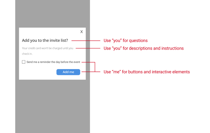 사용자가 버튼을 클릭하거나 확인란을 선택해 제품과 상호작용 할 때 'I', 'me', 'my' 또는 'mine'을 사용합니다. 하지만 이 단어를 사용하는 건 어디까지나 분명히 할 필요가 있는 경우에 한합니다.