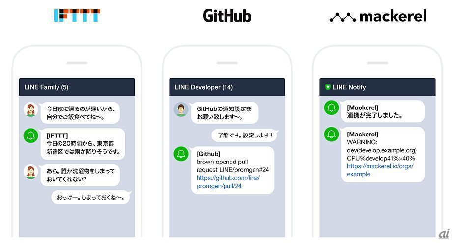 메시징 API에서는 채팅봇이 사용자가 보내는 메시지에 대해 즉시 답장을 보내는 멘션 메시지와 푸시메시지 두 가지로 구분해 사용할 수 있습니다. 웹 서비스 자동 연계 툴은 IFTTT와 연계하면 날씨정보나 특정 메시지를 포함한 메일등을 받을 수 있고 다양한 서비스 알림을 라인으로 받아볼 수 있습니다. 개발자를 위한 소프트웨어 개발 공유 및 관리 툴 GitHub, 서버 관리 및 감시 툴 Mackerel 연계도 시작할 수 있습니다.