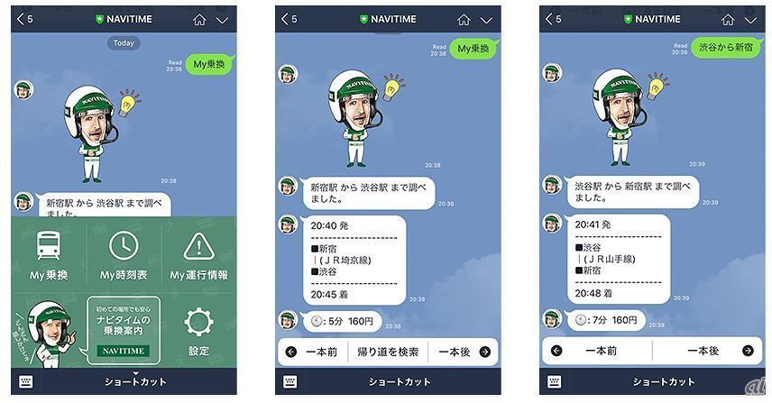 라인에서는 이번 Messaging API를 공개하기에 앞서 파트너 기업들과 함께 챗봇을 사전 개발했습니다. NAVITIME이라는 일본의 길찾기 앱이 그 예인데요, LINE계정 안에서 환승경로와 지하철 및 버스 시간표, 운행 정보를 대화하며 검색할 수 있습니다. 채팅방안에서 '시부야에서 신주쿠까지'라고 적으면 가장 빨리 탈 수 있는 지하철 시간과 환승정보를 바로 답변해줍니다.