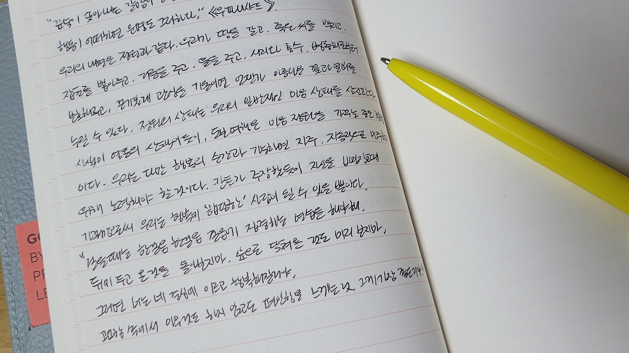 그렇게 책을 필사하기 시작했더니 다시 예전처럼 눈으로만 책을 읽어도 머릿속에 들어오기 시작했다. 그래도 여전히 일주일에 한 번 정도는 퇴근길 카페에 앉아 필사하는 시간을 갖는다. 요즘엔 한 권을 오롯이 그대로 필사하기보다는 아침 출근길 책에서 마음에 드는 문구를 저장해 두었다가 여유 있는 날의 저녁에 수첩에 옮기는 방식으로 쓰고 있다. 어떤 글인지에 따라서 마음 상태가 다르긴 하지만 필사를 하고 나면 마음이 조금 정화되는 기분이 든다.