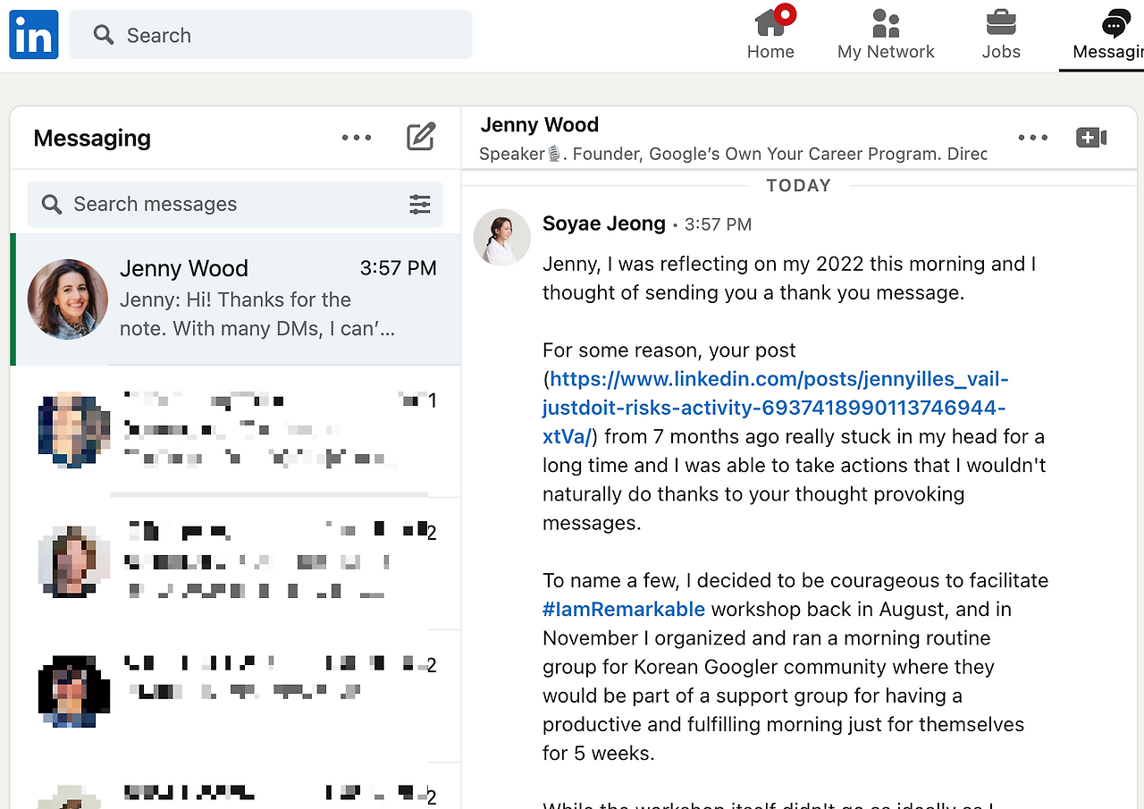 구글의 Own Your Career 프로그램의 파운더인 제니 우드가 작년 상반기에 올렸던 링크드인 포스트의 내용이다.