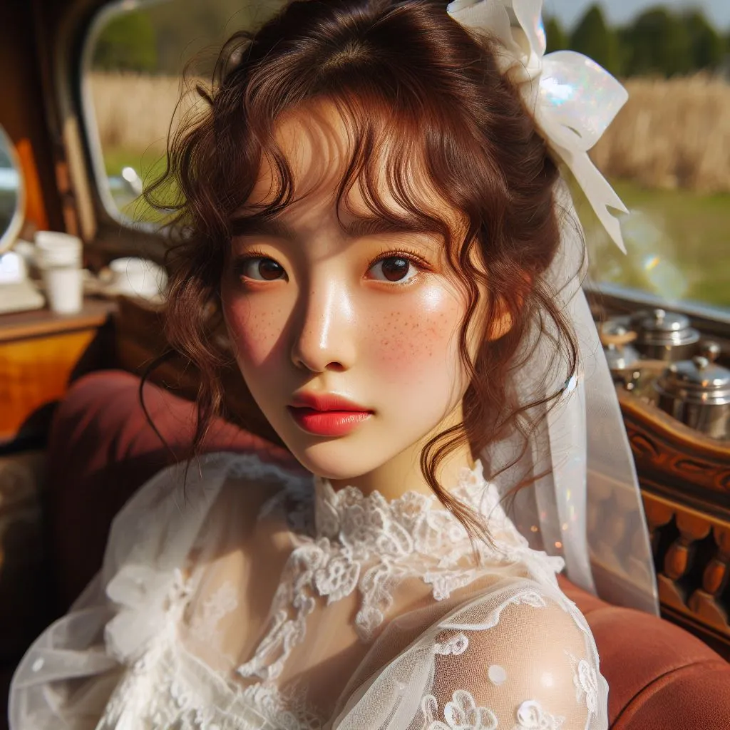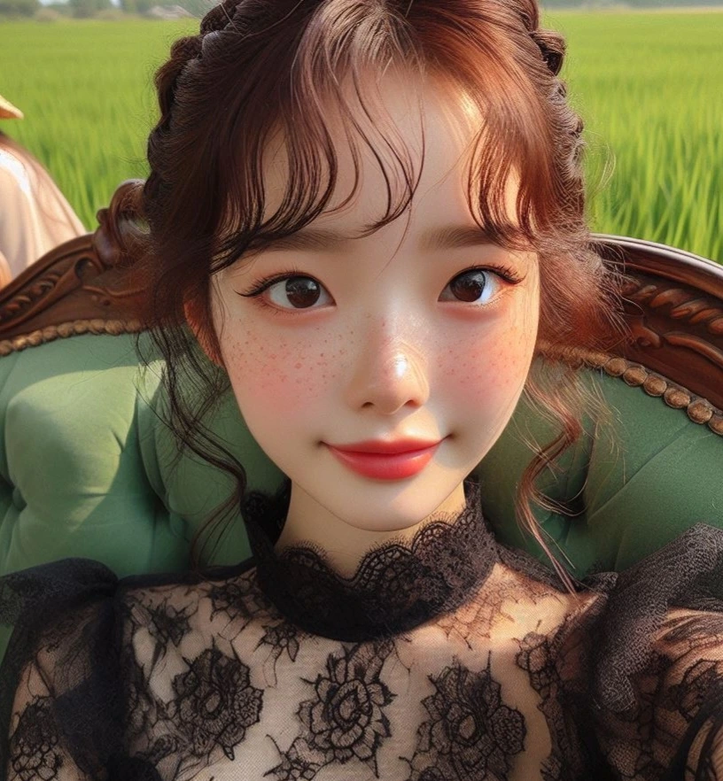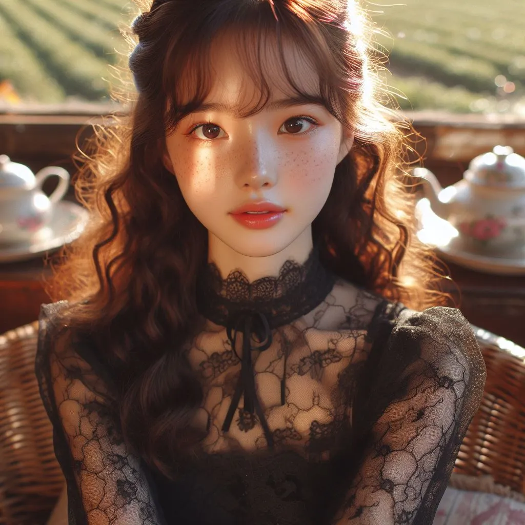 라일락 보라색 한복을 입은 동양 여성, 녹차 밭에서, 그녀의 얼굴에 광선 반사, 프리즘, 햇빛, 낮, 빛 곱슬머리, 패션 촬영, 패션 화보, 패션모델, 동양 얼굴, 작은 주근깨, 오래된 앤티크 나무 소파에 누워, 오래된 필름, 필름 결, 탑 뷰, 높은 각도, 바이 캐논 EOS, 4k, 부드러운 조명, 와이드 샷, 로맨틱 한 분위기, 냉정하고 무료, 측면 누워있는