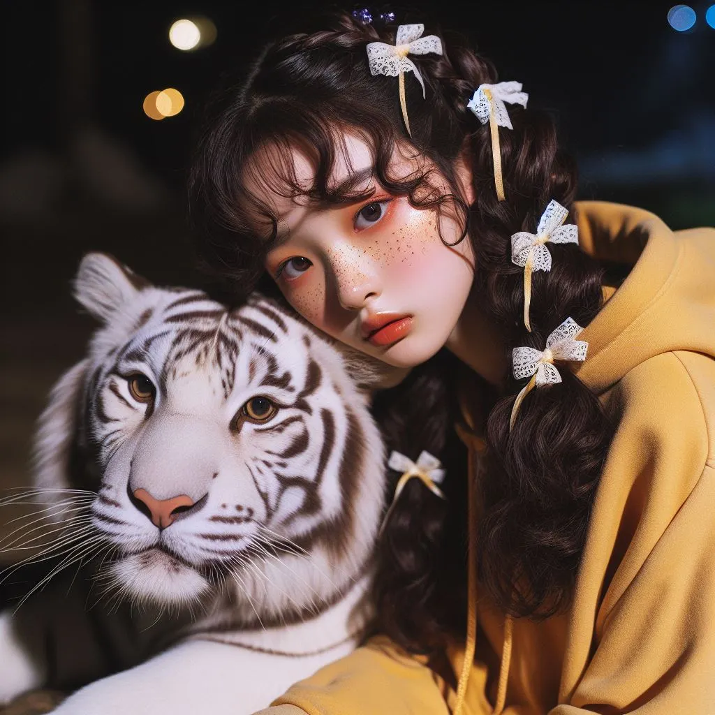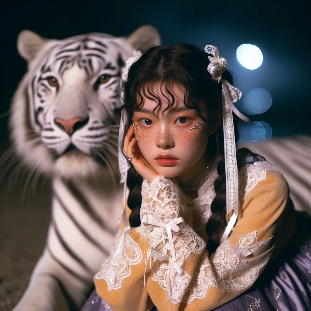 a orient woman wearing deep purple korean traditional dress, silky texture, touching face on real white tiger's cheek, midnight, flash light, film grain and noise, 90s old film, glitters, moon reflections, shiny long hair, fashion pictorial, fahion model, fashion photoshoot, in mountain, high fashion code, looking at camera, soft lighting, close up, fog