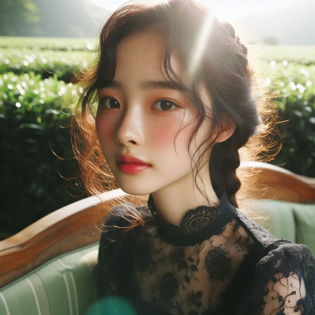 a orient woman wearing lilac purple color korean traditional dress, in green tea field, ray reflection on her face, prism, sunshine, day view, shine curly hair, fashion photoshoot, fashion pictorial, fashion model, orient face, little freckles, lying on old antique wooden sofa, old film, film grain, top view, high angle, by canon eos, 4k, soft lighting, wide shot, romantic mood, chill and fee free, side lying