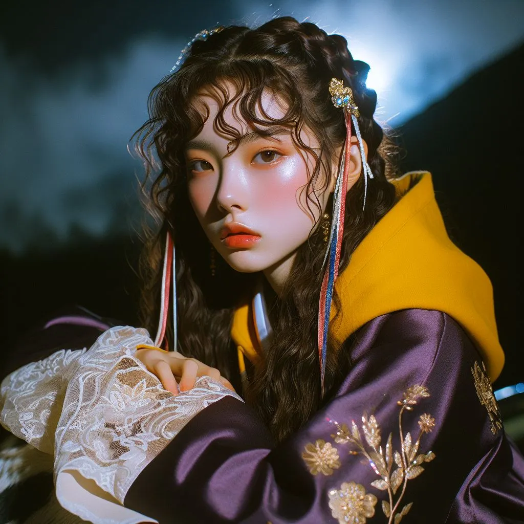 짙은 보라색 한복을 입은 동양인 여성, 부드러운 질감, 진짜 백호 볼에 얼굴을 대고, 자정, 플래시 라이트, 필름 결과 소음, 90년대 오래된 필름, 반짝이, 달 반사, 빛나는 긴 머리, 패션 화보, 패션모델, 패션 화보 촬영, 산에서, 하이패션 코드, 카메라를 바라보는, 은은한 조명, 클로즈업, 안개