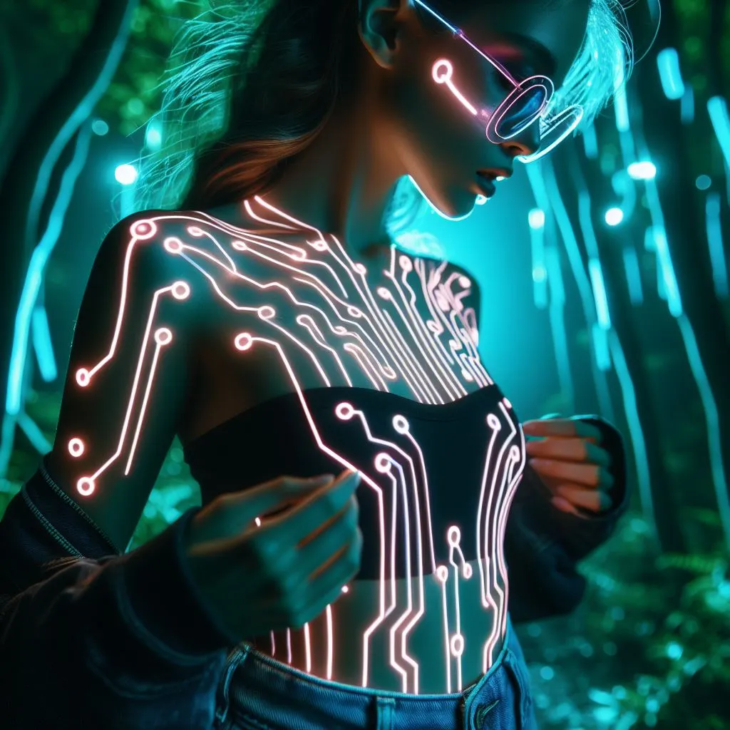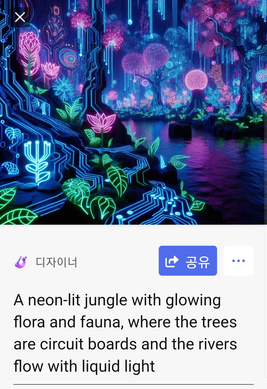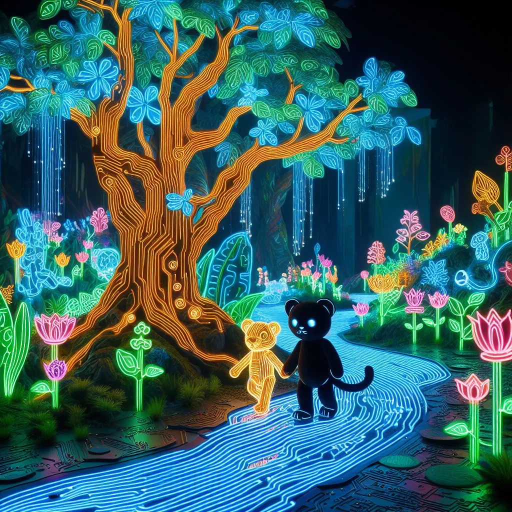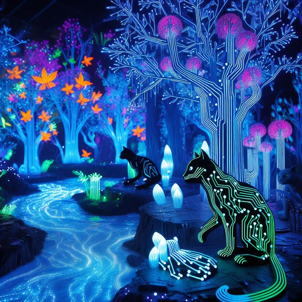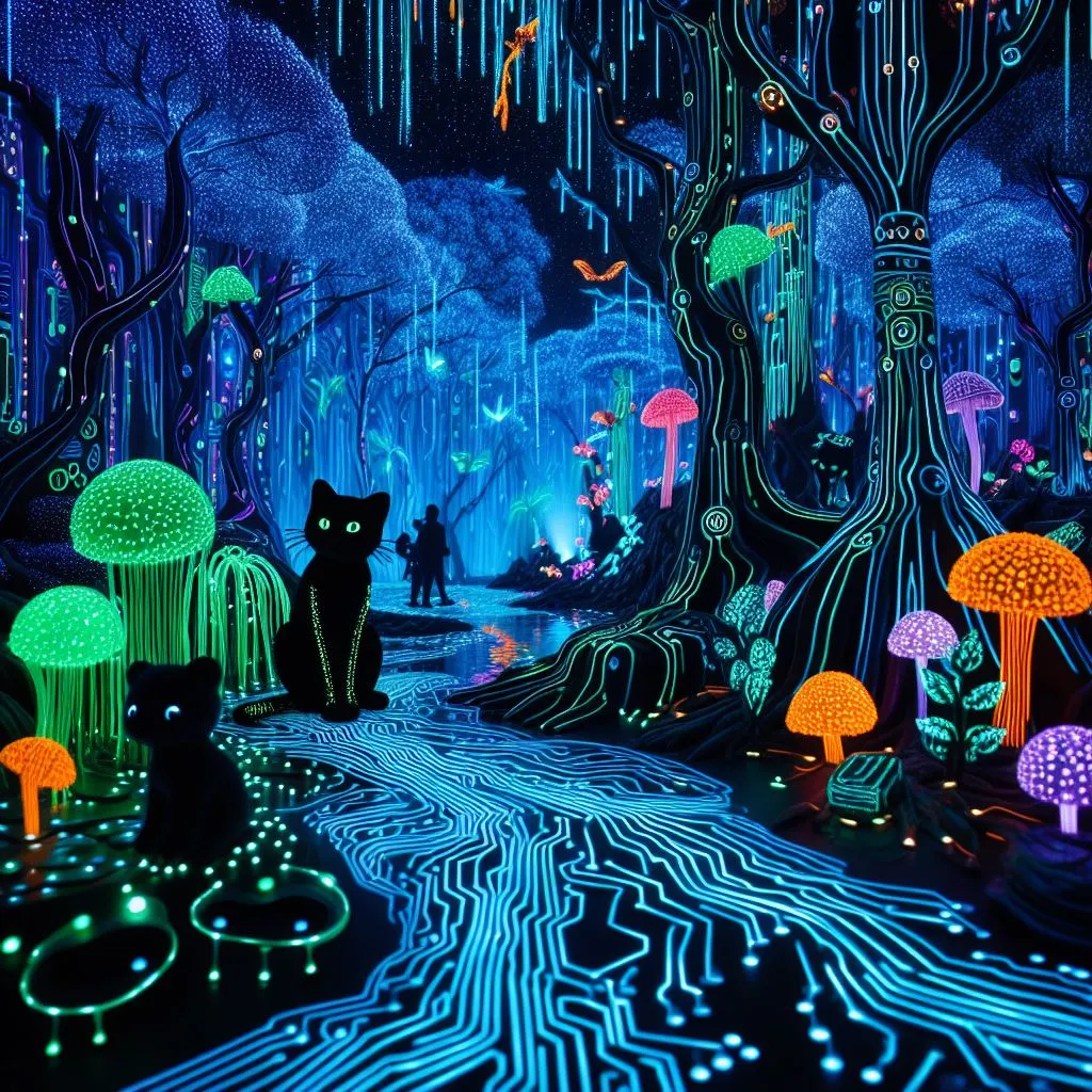 발광하는 식물과 동물로 이루어진 네온 조명이 밝은 정글, 나무들이 회로 기판이고 강물이 액체 빛으로 흐르는 장소