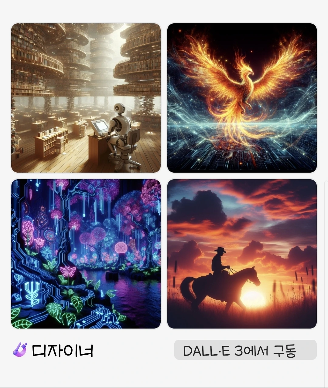 이 이미지들은 가끔 바뀌는데 아래는 현재 빙 이미지 크리에이터 홈에 있는 프롬프트가 적힌 예시 이미지들이다.