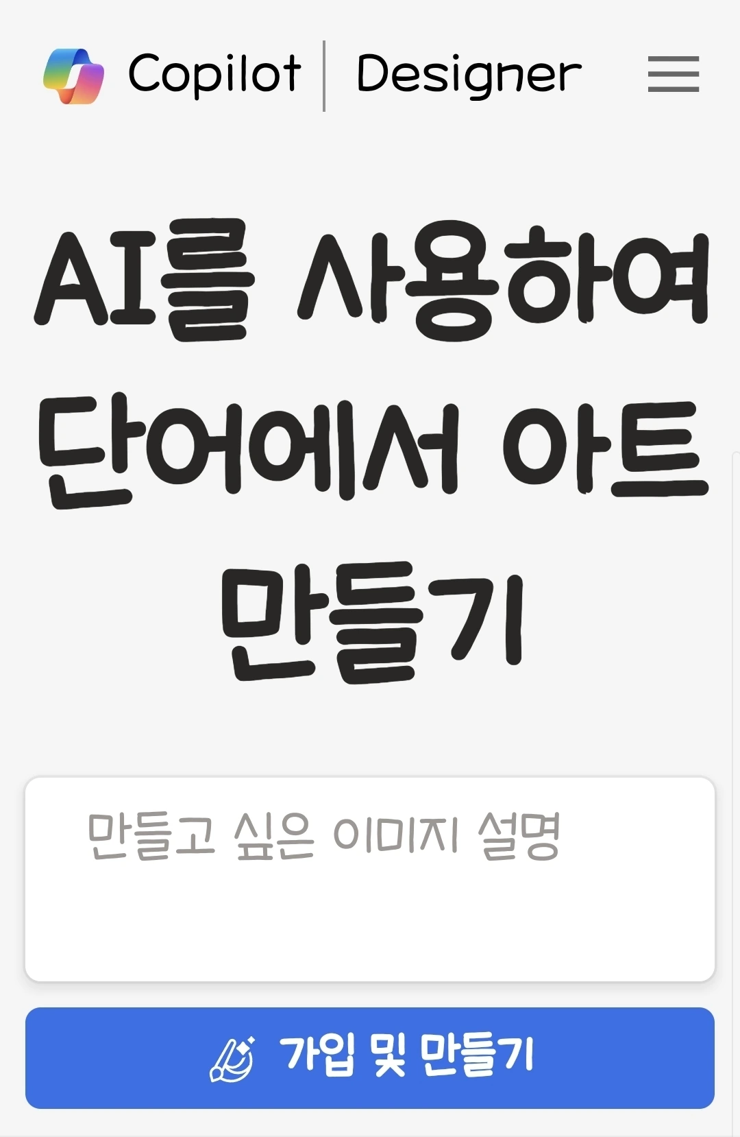 빙 이미지 크리에이터 (이 사이트도 이름이 여러 번 바뀌었는데 사이트 찾을 때는 이 이름으로 찾으면 되고 들어가면 아래 이미지처럼 코파일럿 다자이너로 나온다).