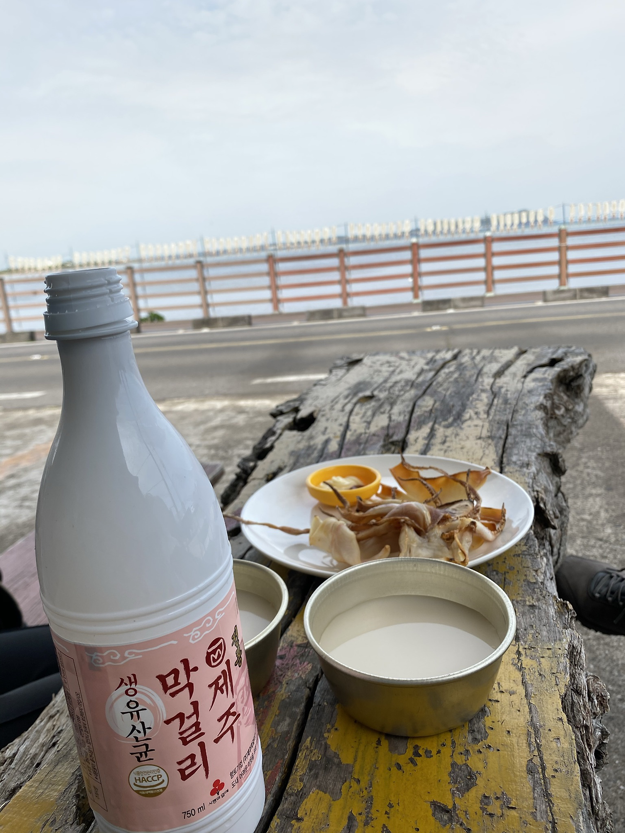 “올레 걸으면서 막걸리 못 먹어서 아쉬운데, 막걸리로 마시자.”