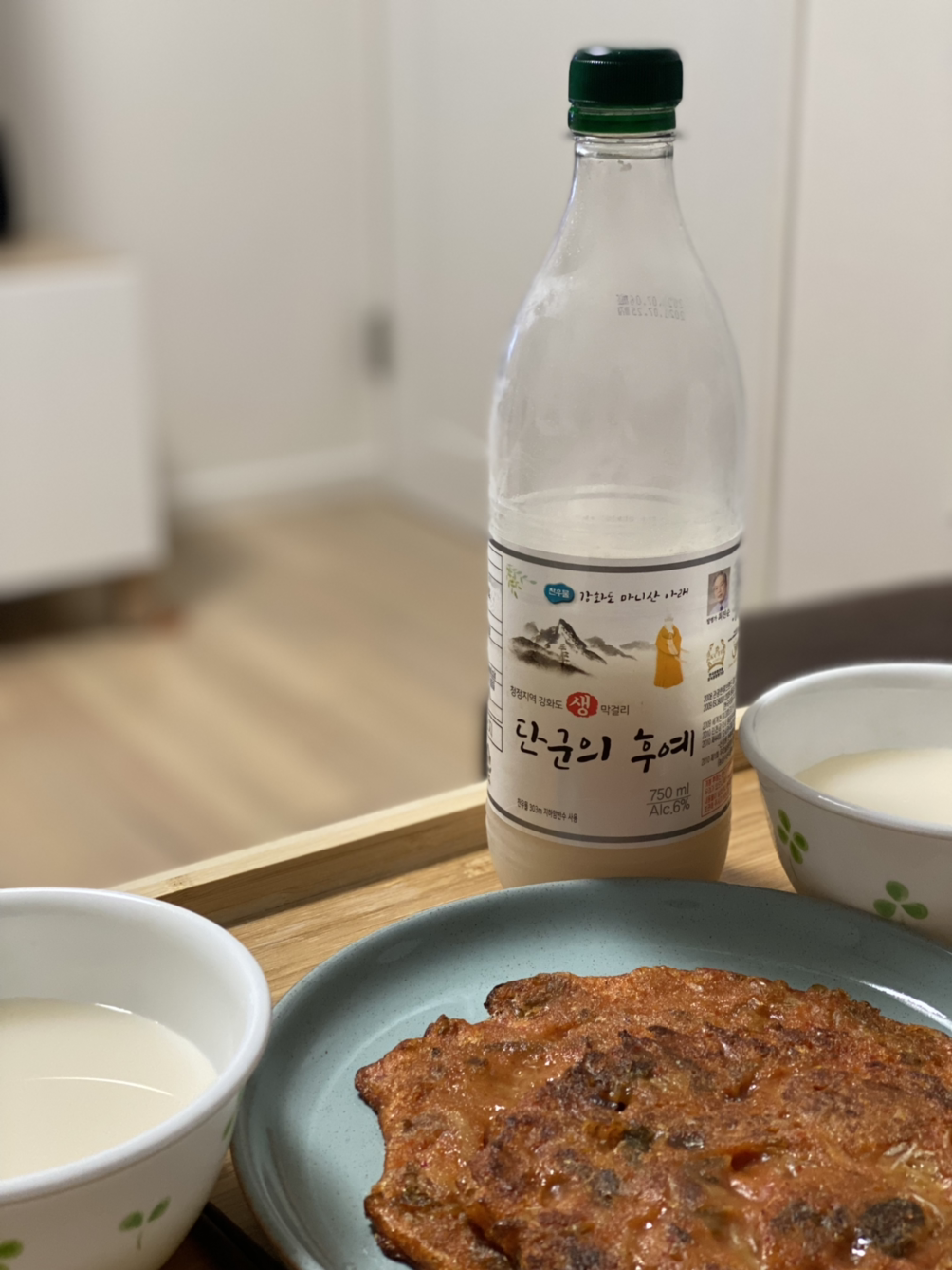 난 막걸리를 마시며 볼 예능 프로그램 하나를 신중히 골랐다. 그리고 주방으로 돌아가서 쟁반에 술상을 차리기 시작했다. 김치전을 담을 접시와 젓가락 그리고 술잔. 그러고 보니 술잔이 좀 애매하다. 맥주잔에 막걸리를 따를 수는 없다고 생각했다. 고민 끝에 밥그릇 두 개를 꺼냈다. 김치전을 완성한 그는 쟁반에 놓인 밥그릇을 힐끗 보더니 별다른 말이 없다. 그 역시 맥주잔에 막걸리를 마시는 것은 아니라고 생각했을 것이다. 김이 모락모락 피어오르는 김치전을 담은 쟁반을 놀이방(TV가 있는 방)으로 옮겼다. 인삼 막걸리도 흔들어서 술잔(아니 밥그릇)에 따랐다. 하얀 액체와 함께 인삼으로 추정되는 알갱이들이 딸려 나온다.