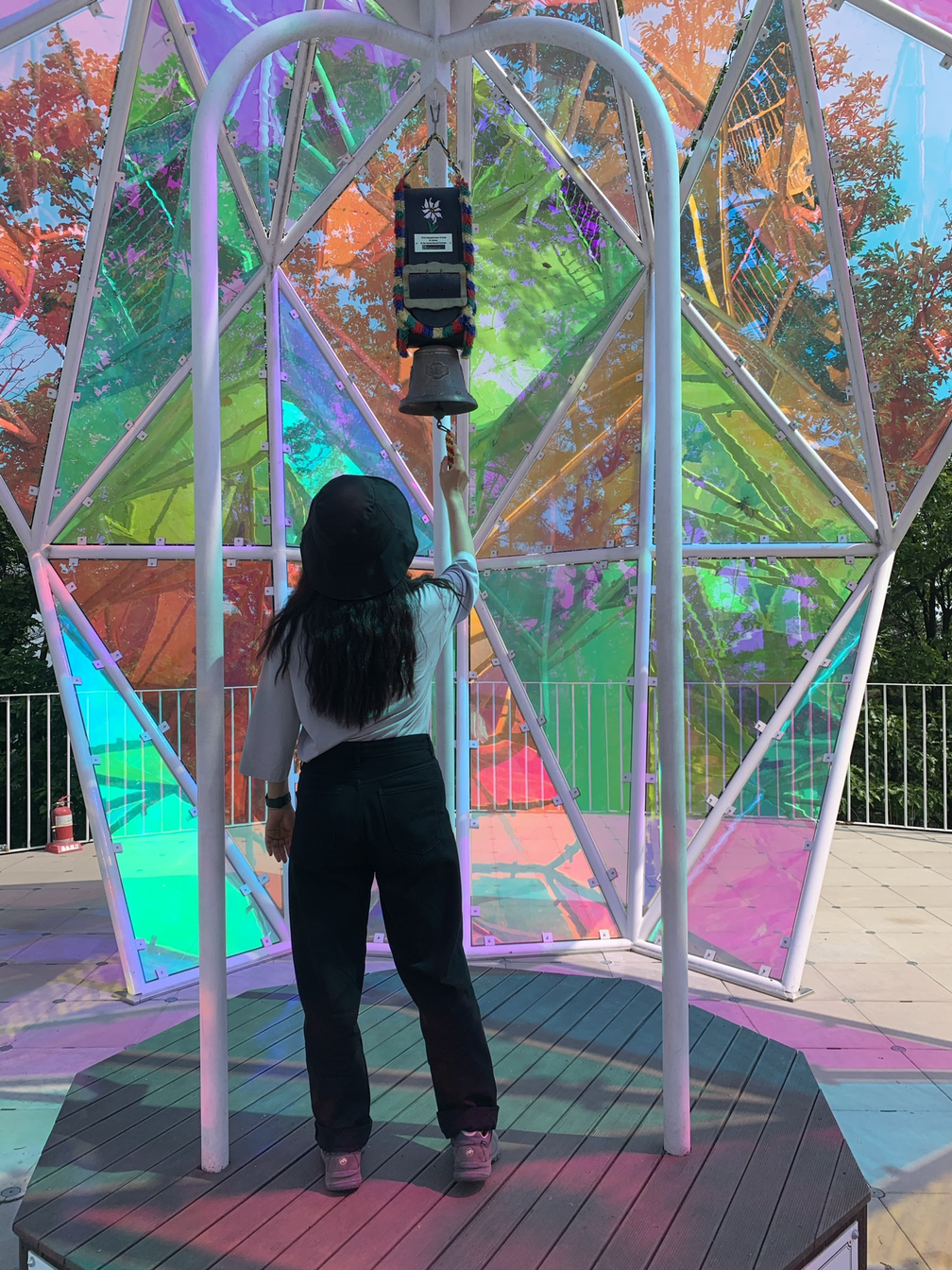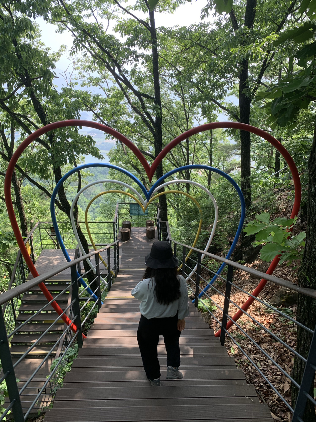 전망대를 돌아보고 다시 내려가려 할 때, ‘약초 숲길과 파빌리온 가는 길’ 안내를 발견했다. 왕복 35분이면 충분하단다. 걷는 걸 좋아하는 우리다. 게다가 35분이면 가벼운 마음으로 다녀올 수 있는 거리다. 하지만 그 길에 접어들자 왠지 속은 기분이 들었다. 왕복 시간은 나와 있었지만, 그 길이 평지라는 말은 없긴 했다. 그리고 여기는 비봉산 정상이다. 말이 없어도, 예상했어야만 했다. 그러니 거짓말이 아니긴 한데.. 아무튼, 가벼운 마음으로 걸을 길은 아니었다. 그곳을 가기 위해서는 무려 531개의 계단을 올라야 했다. 계단이 많긴 했지만 향기로운 숲의 내음을 맡으며 걷기는 좋았다. 마침내 파빌리온에 도착했을 때 우리는 ‘축복의 종’을 울리며 건강과 풍요로움을 기원했다.
