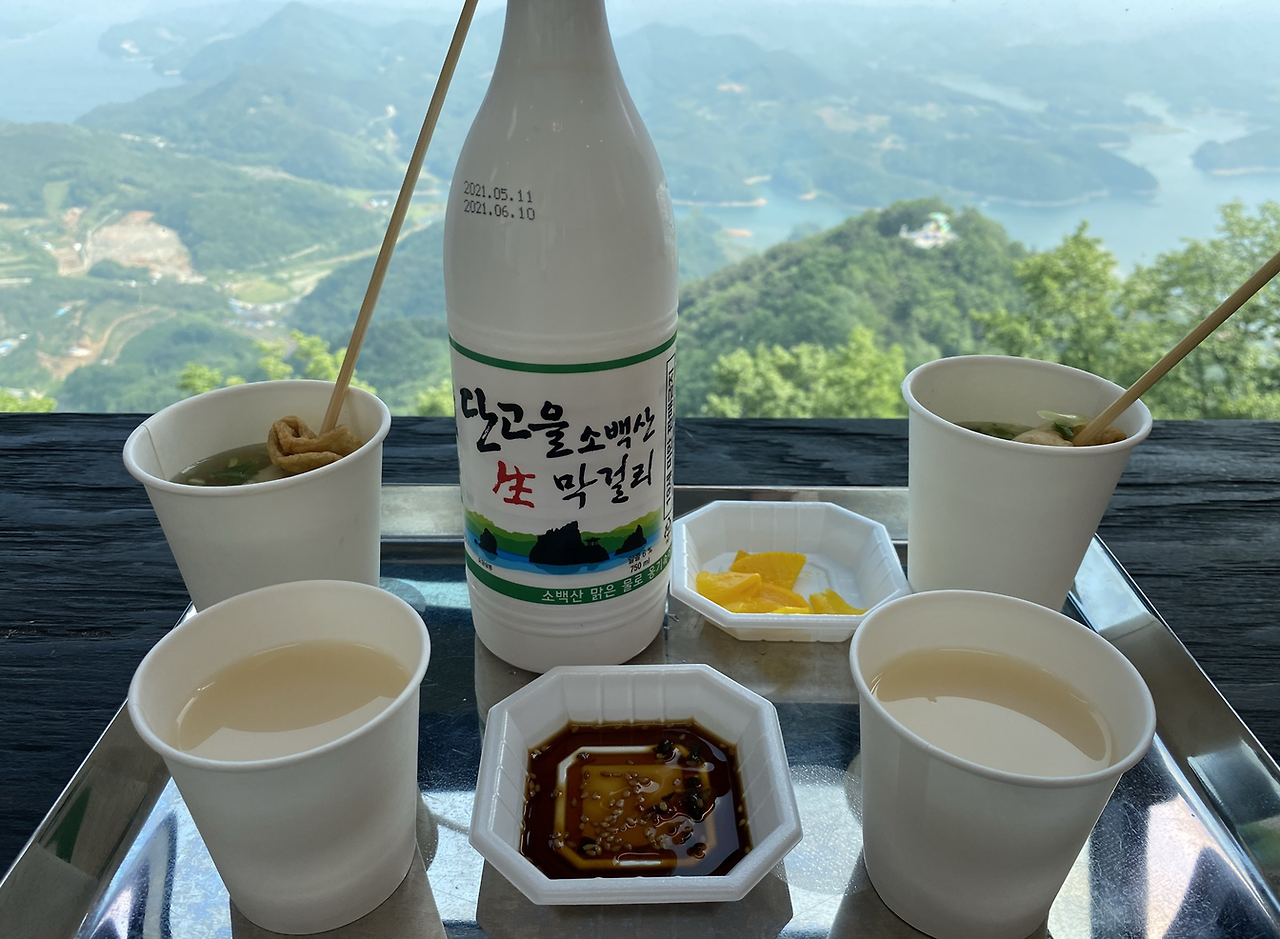 전망대에는 사케와 막걸리를 파는 곳이 있었다. 우리는 어묵을 안주로 막걸리 한 병을 시켰다. ‘단고을 소백산 막걸리’였다. 다른 막걸리보다 좀 더 달았고, 목 넘김이 부드러웠다. 창 밖으로는 청풍호 풍경이 한눈에 내려다보였다. 배가 고팠기에 순식간에 어묵 하나씩을 다 먹고는 막걸리 한 모금에 청풍호 풍경 한 번 보며 막걸리를 마셨다. 땀 흘리고 난 이후의 술 한잔에 다른 건 필요 없었다. 그것은 막걸리 한잔의 축복이다.