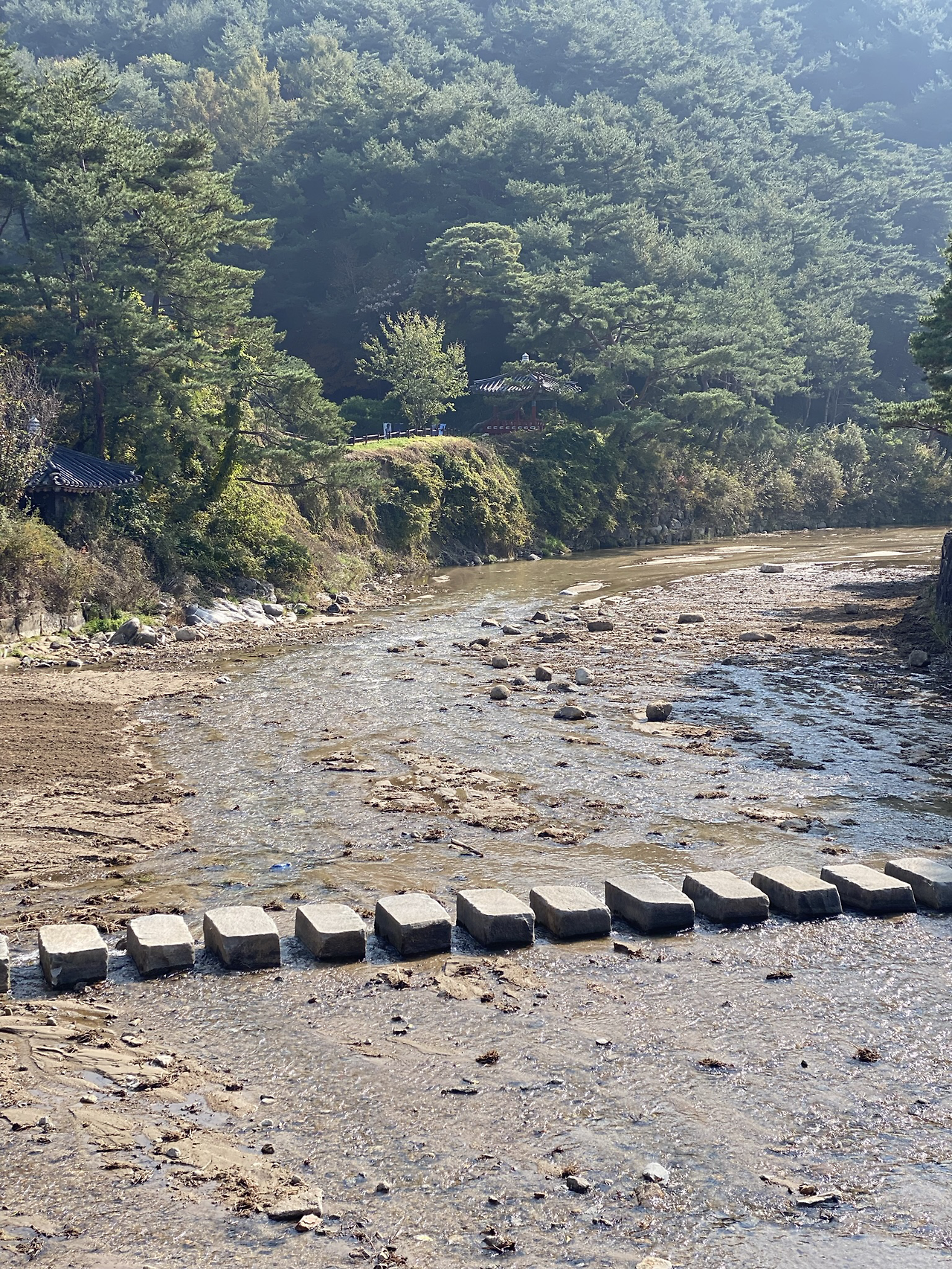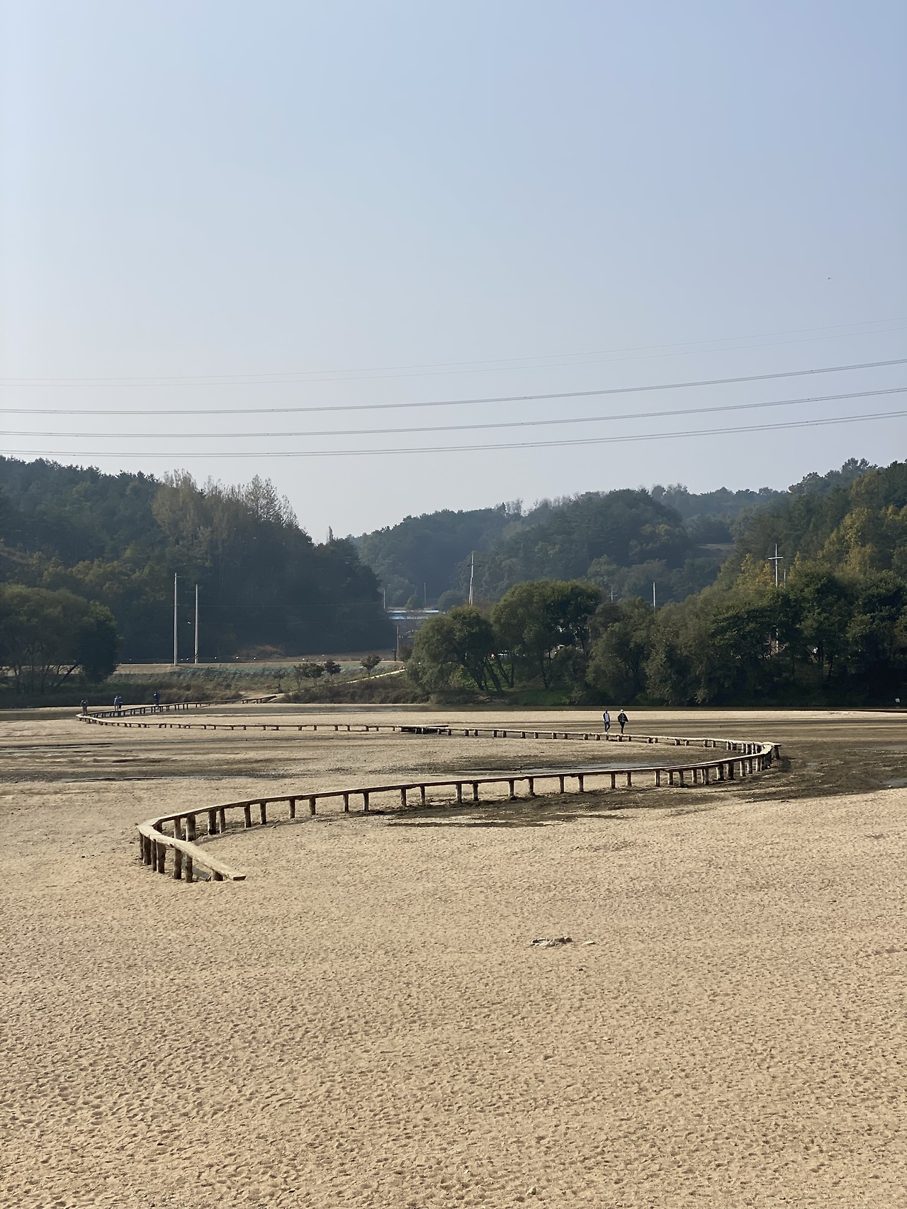 다음날 영주로 향했다. 소수서원만 가고 싶다더니 엄마의 간 김에는 계속 추가됐다. 청량산에 올라갈까. 무섬마을은 어때. 등등. 엄마 우리가 3박 4일쯤 여행 온 게 아니야. 오늘 올라가야 하는데 산은 무리지. 가는 길에 있는 무섬마을만 엄마의 간 김에 목록에 더했다. 무섬마을은 내성천으로 둘러싸인 마을인데, 이 내성천을 건너는 외나무다리가 유명했다. 통나무를 반으로 갈라 곡선으로 이어진 외나무다리. 옛 선비들은 효율보다는 풍류를 위한 아름다움을 더 중요하게 생각했음이 틀림없다. 직선으로 만들면 될 것을 굳이 모래 위에 붓으로 그림을 그린 듯 유려한 곡선으로 만든 것을 보면. 사람들은 다리 위에서 저마다 사진을 찍었고, 뒤에선 이들을 가만히 서서 기다렸다. 이 기다림은 서로 양해된 것이었다. 건너기 위함이 아닌 즐기기 위한 다리니까.
