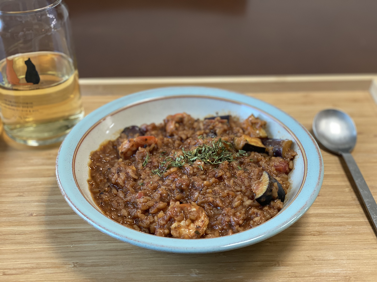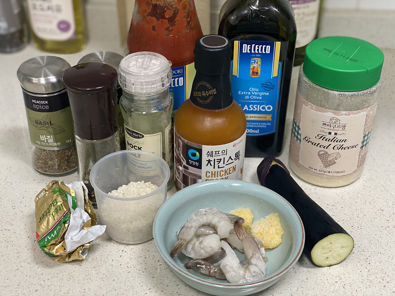 물이 조금씩 졸아들자 토마토소스와 바질, 치즈를 넣었고, 10분쯤 후에는 새우와 가지를 넣은 후 소금, 후추로 간을 했다. 그리고 5분을 더 저은 후 불을 끄고 그릇에 옮겨 담았다. 마늘이 타서 토마토 리조또의 색이 거무죽죽했다. 이거 먹어도 될까 슬슬 걱정되기 시작한다.