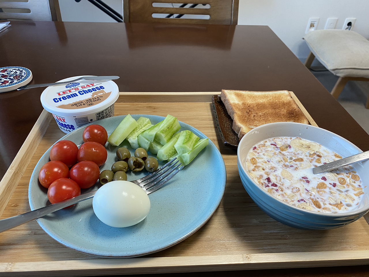 그와 카톡으로 하루를 얘기한다. 아침 상을 차리고 그에게 전송했다. 잠시 후 그도 사진을 보내온다. 졌다. 돼지고기 덮밥. 음료까지 해서 3,000원 정도란다. 방콕에서 먹었던 팟타이를 비롯한 맛있는 음식의 맛이 입안을 가득 맴돈다. 아, 그가 부럽다. 뭐 나의 아침도 나쁘지 않다. 이 정도면 건강식이니 괜찮다.