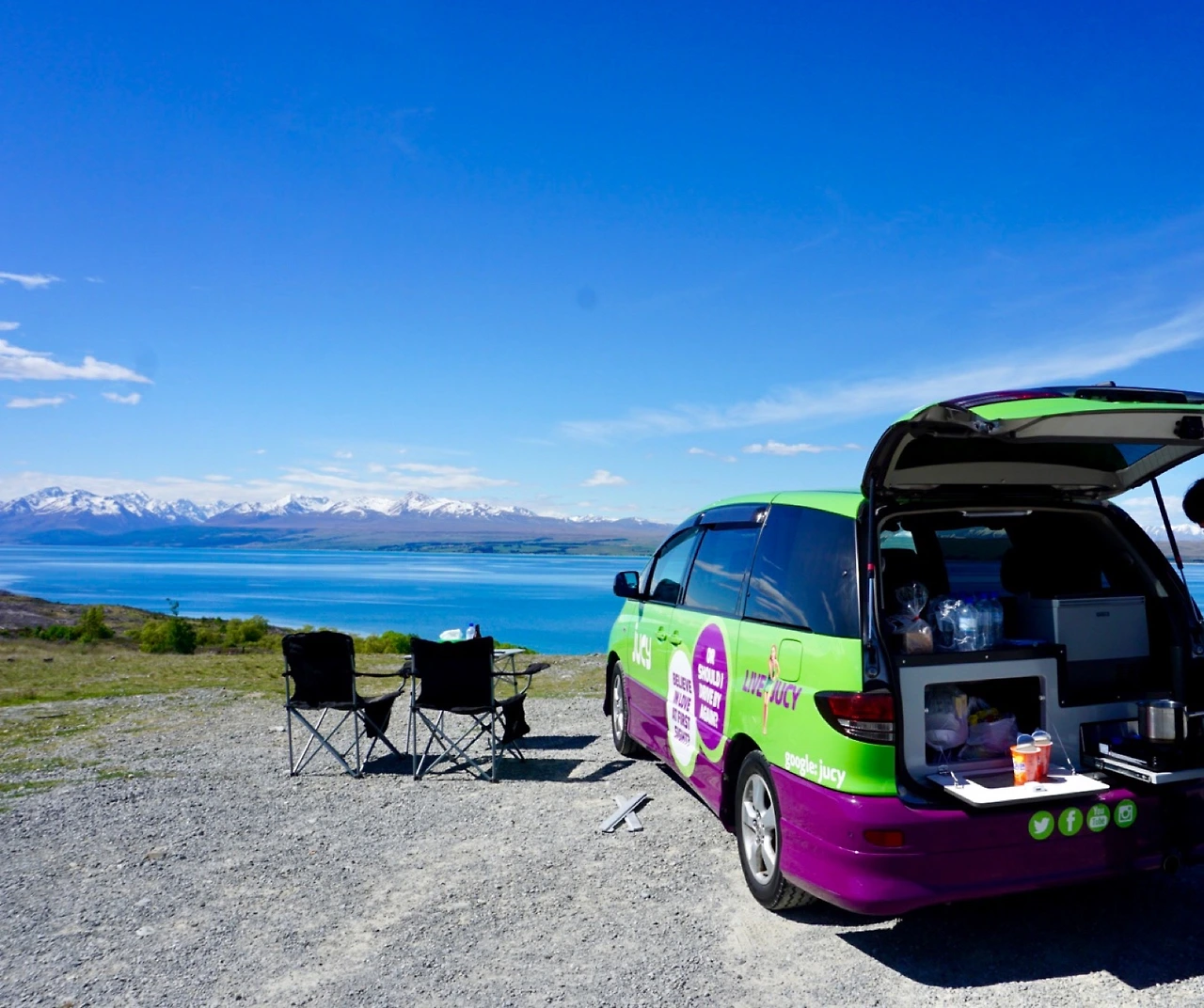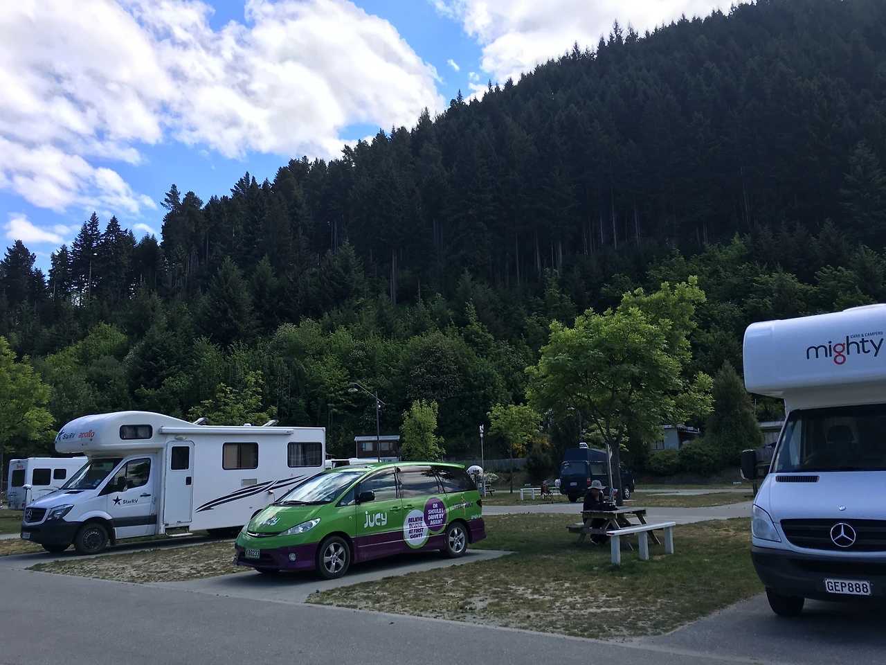 뉴질랜드에서는 jucy 캠핑카를 빌렸다. 우리가 빌린 차량은 jucy에서 가장 작은 캠핑카였다. 카니발 정도의 크기였고, 렌트비가 하루 7만 원 정도로 굉장히 저렴했다. 숙박과 교통을 동시에 해결하는데 7만 원 밖에 들지 않는다는 점이 마음에 들었다. 뒷자리는 두 사람이 잠만 잘 수 있을 정도의 크기였고, 의자 아래에는 수납공간이 있었다. 테이블 모드와 침대 모드가 둘 다 가능했으나 우린 거의 침대 모드로 해두고 사용했다. 차 트렁크에서는 간단한 조리가 가능했다. 작은 사이즈의 냉장고가 있었고, 싱크대가 있긴 했으나 음식물 저장 공간처럼 쓰였다. 조리용으로 휴대용 가스레인지도 제공했다. 호수가 보이는 도로를 달리다가 마음에 드는 풍경이 보이면 주차를 하고 캠핑 의자와 테이블을 꺼냈다. 트렁크 조리대는 풍경을 바라보며 라면을 끓여 먹는 데는 충분한 크기였다. 뉴질랜드에서 캠핑 경험이 좋았기에 차를 카니발로 바꾸고 캠핑을 다니자고 한동안 남편을 졸랐다. 남편은 “우리나라에는 뉴질랜드 같은 캠핑장이 별로 없잖아, 차가 작아도 캠핑장에서 다 해결이 가능해서 편했던 거야.”라고 말했다. 하긴, 차는 이동과 침대의 역할만 했고, 화장실, 샤워, 요리는 모두 캠핑장에서 해결했다. 사람도 많지 않고 깨끗해서 불편함이 전혀 없었다. 비용도 하루에 인당 만원 정도면 해결되었다.