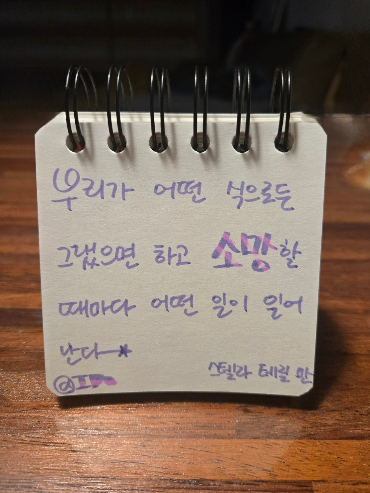 오전부터 여기저기서 새해인사를 전해주시는 연락을 많이도 받았습니다. 인사말은 다 다르지만 그 안에는 서로의 복을 빌어주는 마음이 담겨있었어요. 그렇게 세상에 뿌려진 응원의 말이 이루어지기 바라며 저도 소망명언을 적어보았습니다.